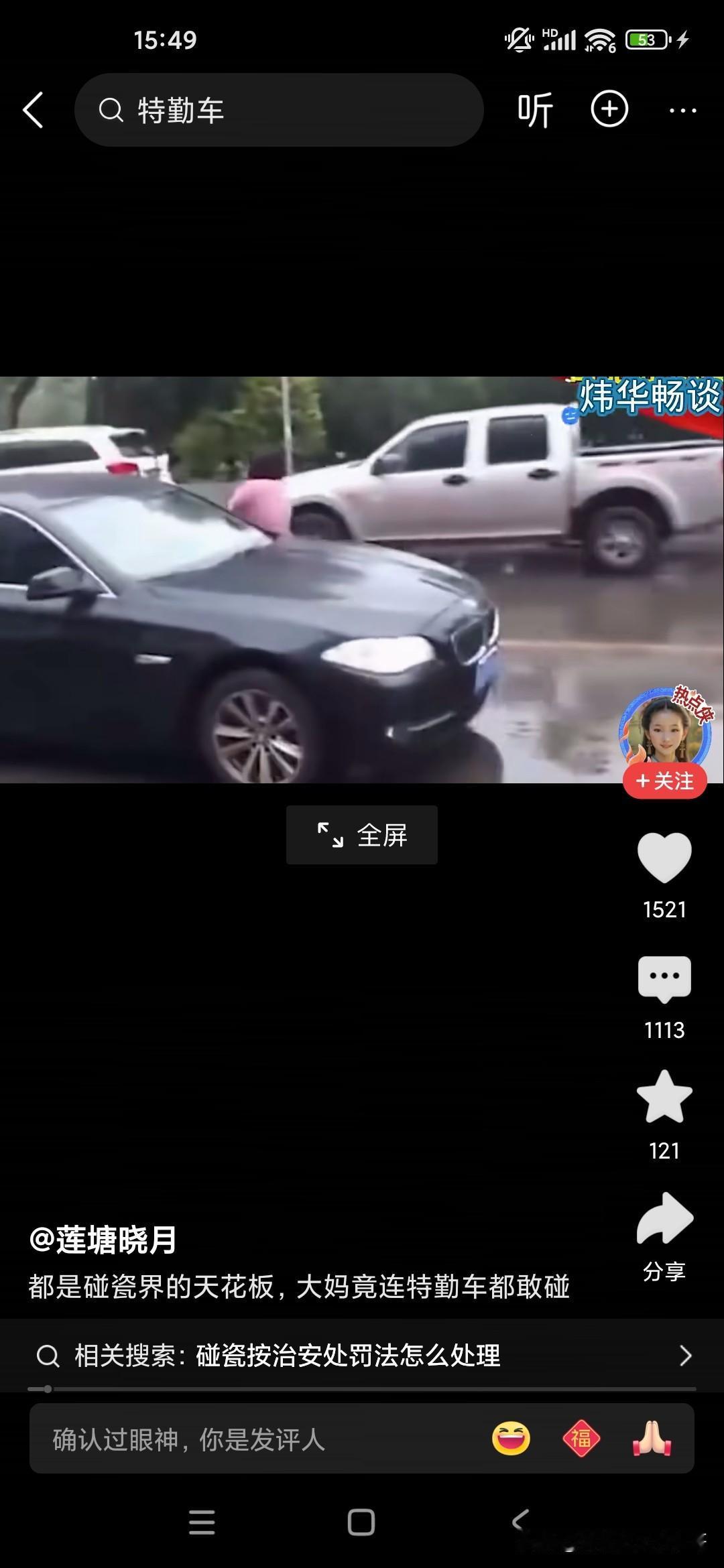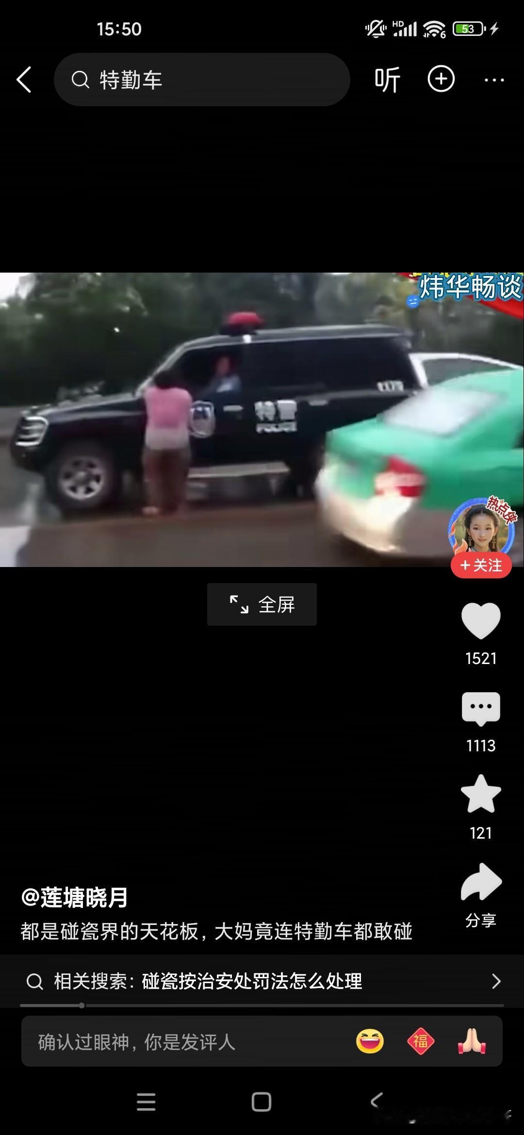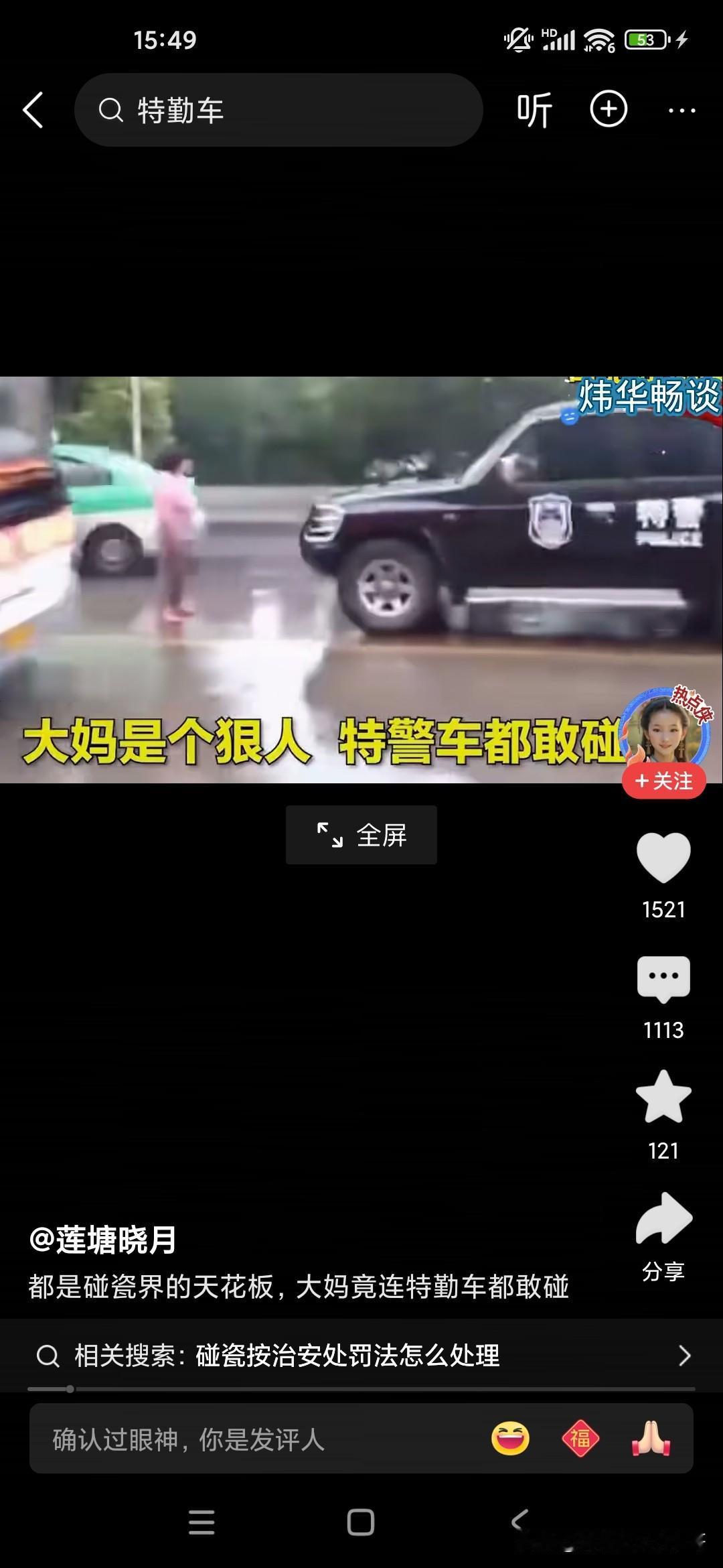 也许这些年我运气比较好,所以说通常的话呃在路上也没有碰到这种碰瓷的,只是偶尔在视频上会刷到,有些是结婚的时候碰到碰瓷的,有的是故意被碰瓷的,可能是没有碰到什么狠人,我记得有一个东北的老大爷因为碰瓷还被车主追杀,如果不是妻子拉着,估计就把他砍死了。视频中这个大妈的话可能也不太识字,然后的话就在车在川流不息的这个路上的话,不停的碰瓷,一会儿找这个,一会儿找那个,后来看了一个SUV,不知道是特警车,然后还上前碰瓷,结果立即就被抓了,他也是撞到枪口上去了!