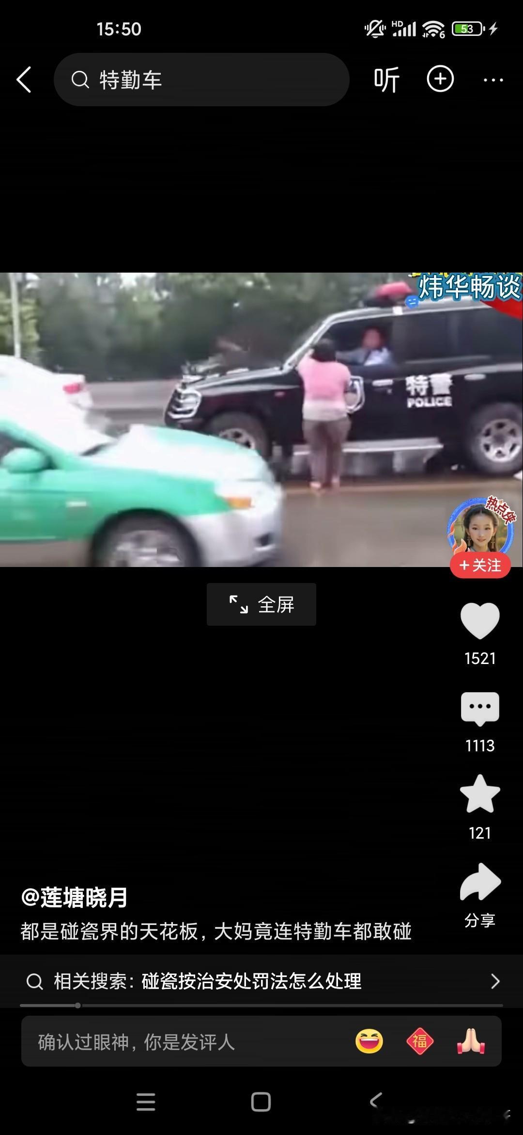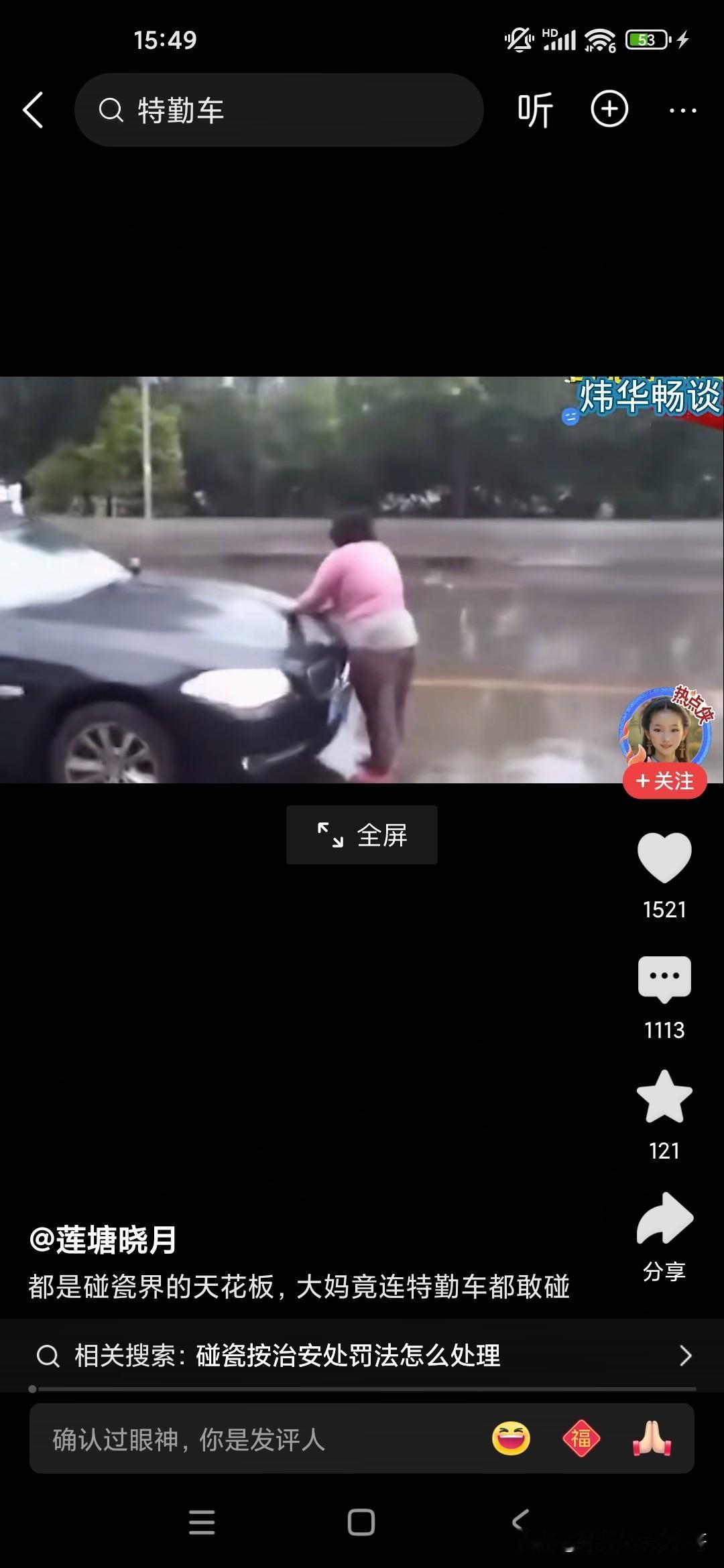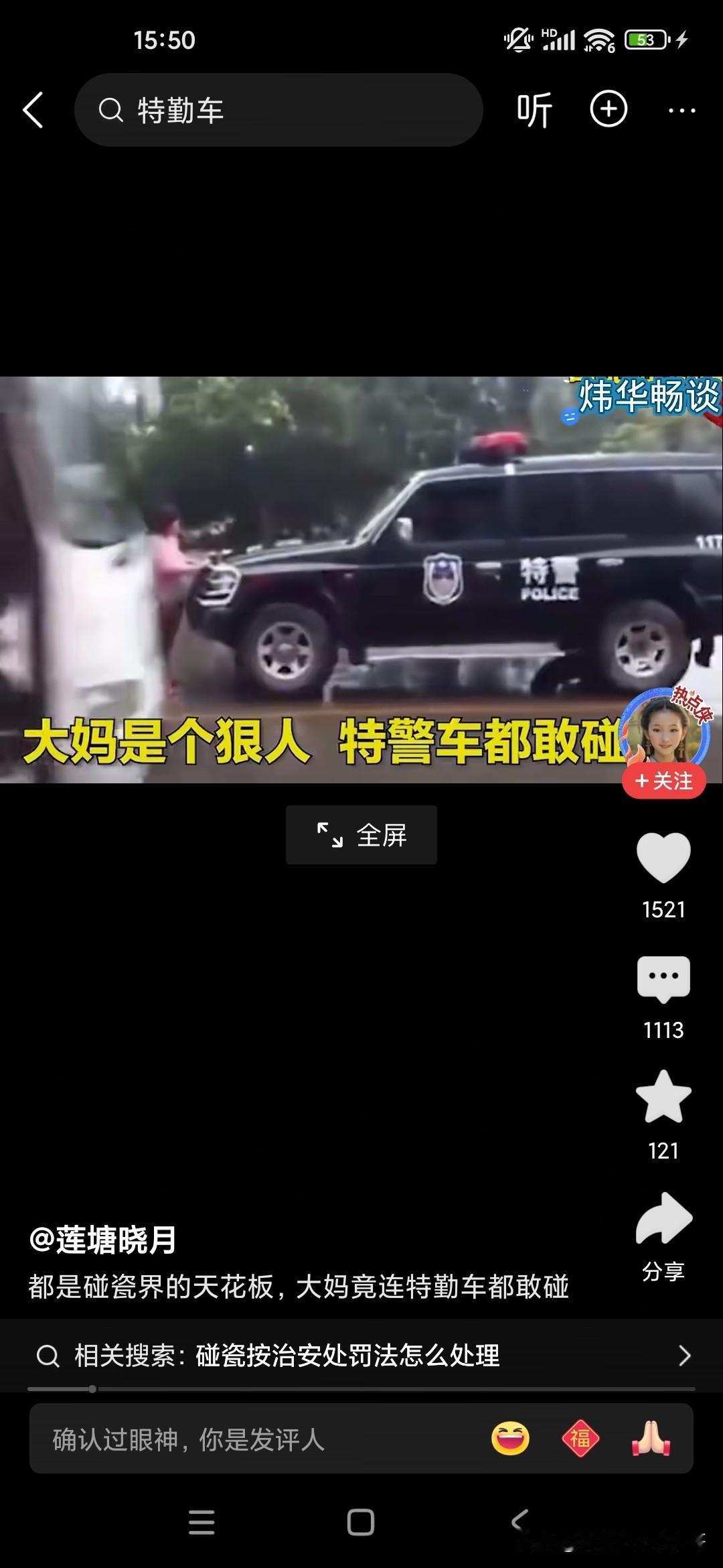 也许这些年我运气比较好,所以说通常的话呃在路上也没有碰到这种碰瓷的,只是偶尔在视频上会刷到,有些是结婚的时候碰到碰瓷的,有的是故意被碰瓷的,可能是没有碰到什么狠人,我记得有一个东北的老大爷因为碰瓷还被车主追杀,如果不是妻子拉着,估计就把他砍死了。视频中这个大妈的话可能也不太识字,然后的话就在车在川流不息的这个路上的话,不停的碰瓷,一会儿找这个,一会儿找那个,后来看了一个SUV,不知道是特警车,然后还上前碰瓷,结果立即就被抓了,他也是撞到枪口上去了!