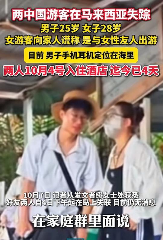 “说是跟闺蜜去马来西亚旅游,结果是跟一个男的。”28岁的中国女子向父母撒了一个弥天大谎。但此刻,女儿和那位25岁的中国男伴,已经彻底失联。 失联之前,该女子一直都在跟家里报平安,从出发到景点,报备得滴水不漏。谁能想到,这竟是一种故意的掩盖和心虚。当报备停止后,父母接到的就是从马来西亚打来的失联电话。 目前所有的线索,都让家人心里拔凉,因为它们都指向一个地方:海中央。 手机掉海里了,事情就不简单了。 男子的耳机一个在市区,一个在海里,这还能用“被偷”或者“大意”来解释。但手机这种绝不离身的物件,居然跑到了大海中央,这八成是两人下水游泳时出的事。 还有其他旅客拍到了疑似两人穿着潜水服的画面,这个画面定格在下水前:女子穿着泳衣,男子套着潜水服,手里还拿着呼吸面罩,正沿着海岸边走。家人看了这个照片,确认八九不离十就是他们。 当时海岸边的天气已经非常糟糕了。下午四点多还是阴天,结果一小时后就开始下雨,第二天早上直接就暴雨倾盆。如果他们是在那个时间段冒险下海,恶劣的天气直接让遭遇不测的可能性翻了好几倍。 现在,线索串起来了,结局几乎是板上钉钉了,现在只能祈祷奇迹出现了。