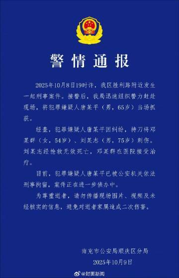 【警方通报:#65岁男子因纠纷持刀刺伤两人#】#75岁男子被65岁男子刺伤致死#10月9日,四川南充市公安局顺庆区分局发布警情通报:2025年10月8日19时许,我区胜利路附近发生一起刑事案件。接警后,我局迅速组织警力赶赴现场,将犯罪嫌疑人唐某平(男,65岁)当场抓获。