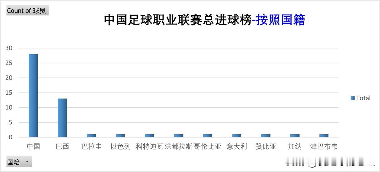 中国职业足球 - 历史总进球榜!武磊最多!扎哈维场均恐怖! 中国职业足球联赛(甲A,中超)进行了31年,从历史总进球榜中我们可以看到: 1,巴西外援,除了中国本土球员外,巴西外援是进行最多的群体,超过了其他国家外援的总和。这说明,我们的职业联赛,还是巴西外援比较吃香。 2,武磊,以166球高居射手榜首位,相信这个记录,10年内没有人可以打破。当然,我们都知道,这个与奥斯卡的中场输送炮弹密不可分,但还是可以看出来武磊出色的射手本能。 3,扎哈维,以场均0.87球的恐怖数据,独领中国职业足球历史的场均射手榜。效力于广州富力的几个赛季中,105场97球的惊人数据,相信很难再出现了。 4,带刀后卫, 天津泰达的队长曹阳,以53球高居历史射手榜42位,以边后卫和中后卫的标准来看,这个记录也很难被打破了。 中国职业足球任重而道远,希望能有更多的年轻球员涌现出来,打破前人的记录。 而我们现阶段中超联赛,太需要年轻球员上来了,因为正在当打之年的国内球员是水平最低的,严重影响了联赛的质量。