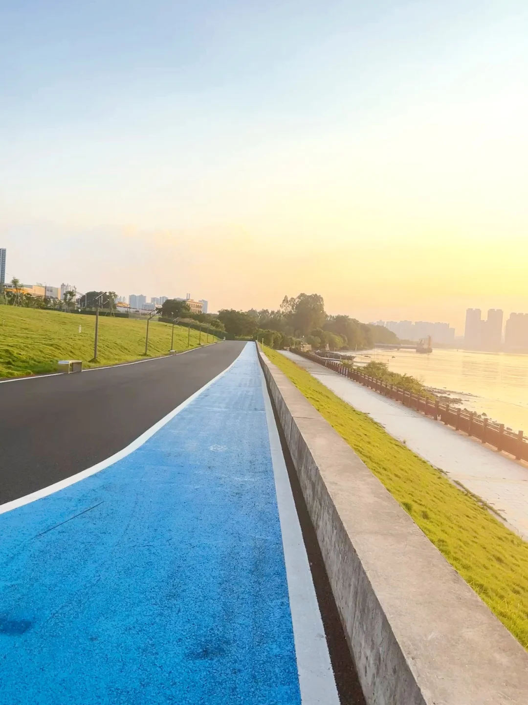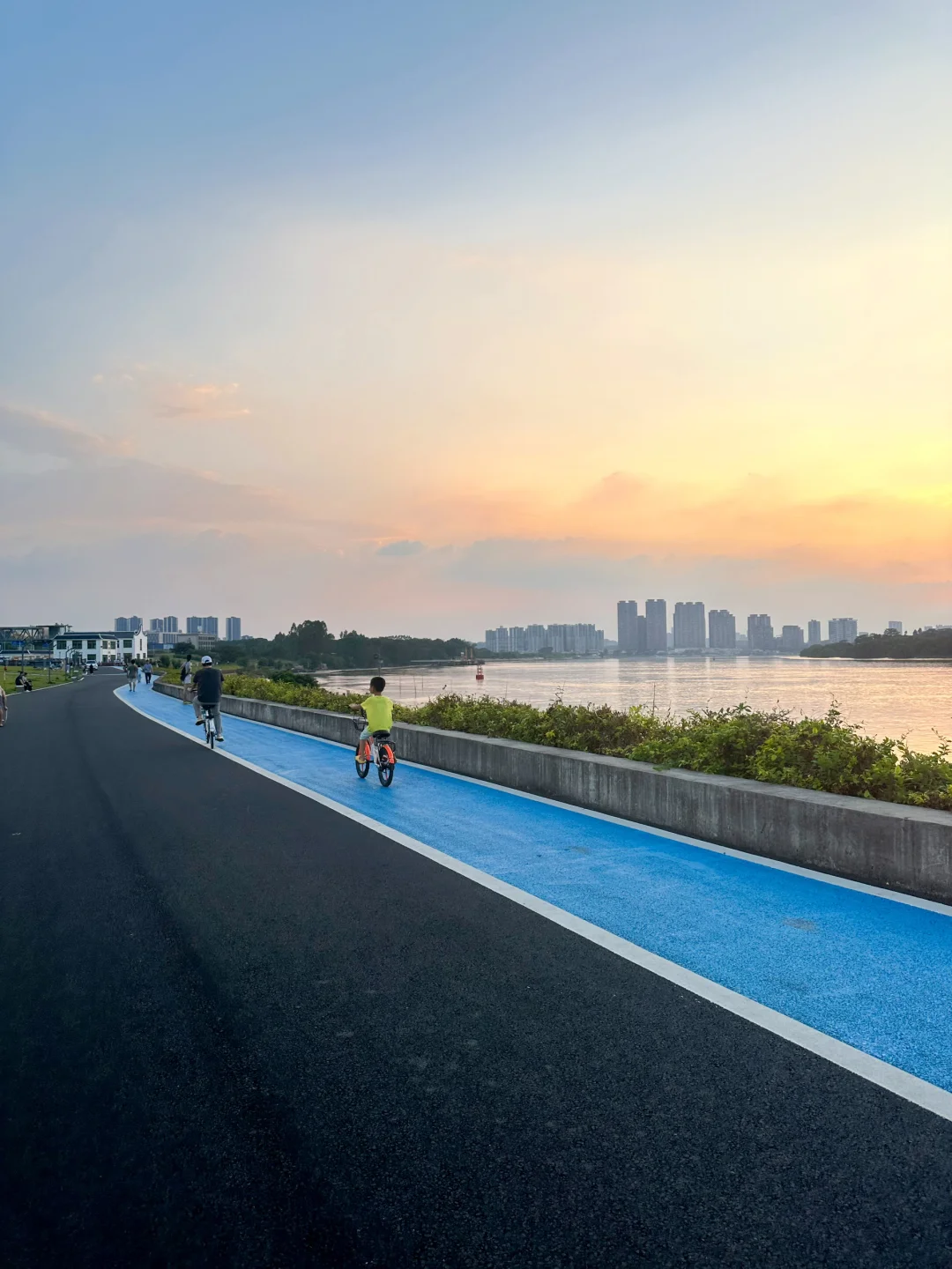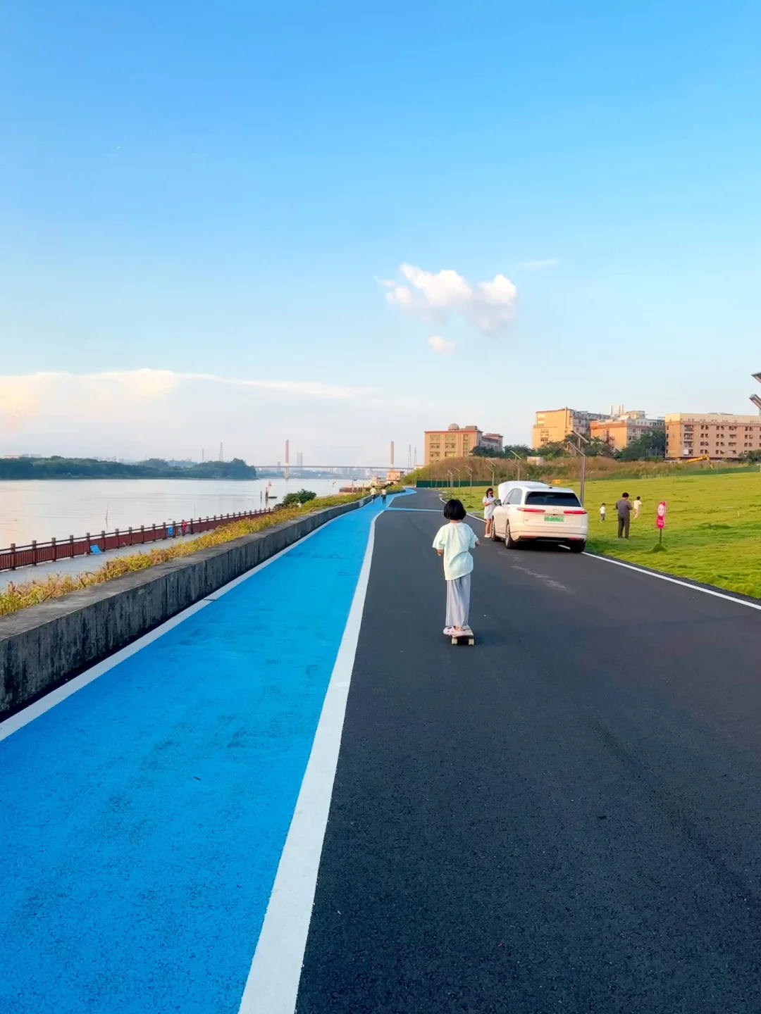 这里有一大片绿油油的草坪,2km的临江绿道,好适合骑行和玩滑板!没什么人和车!!大草坪上野餐、遛娃、遛狗、钓小螃蟹、江边看日落,好惬意!完美避开人流!