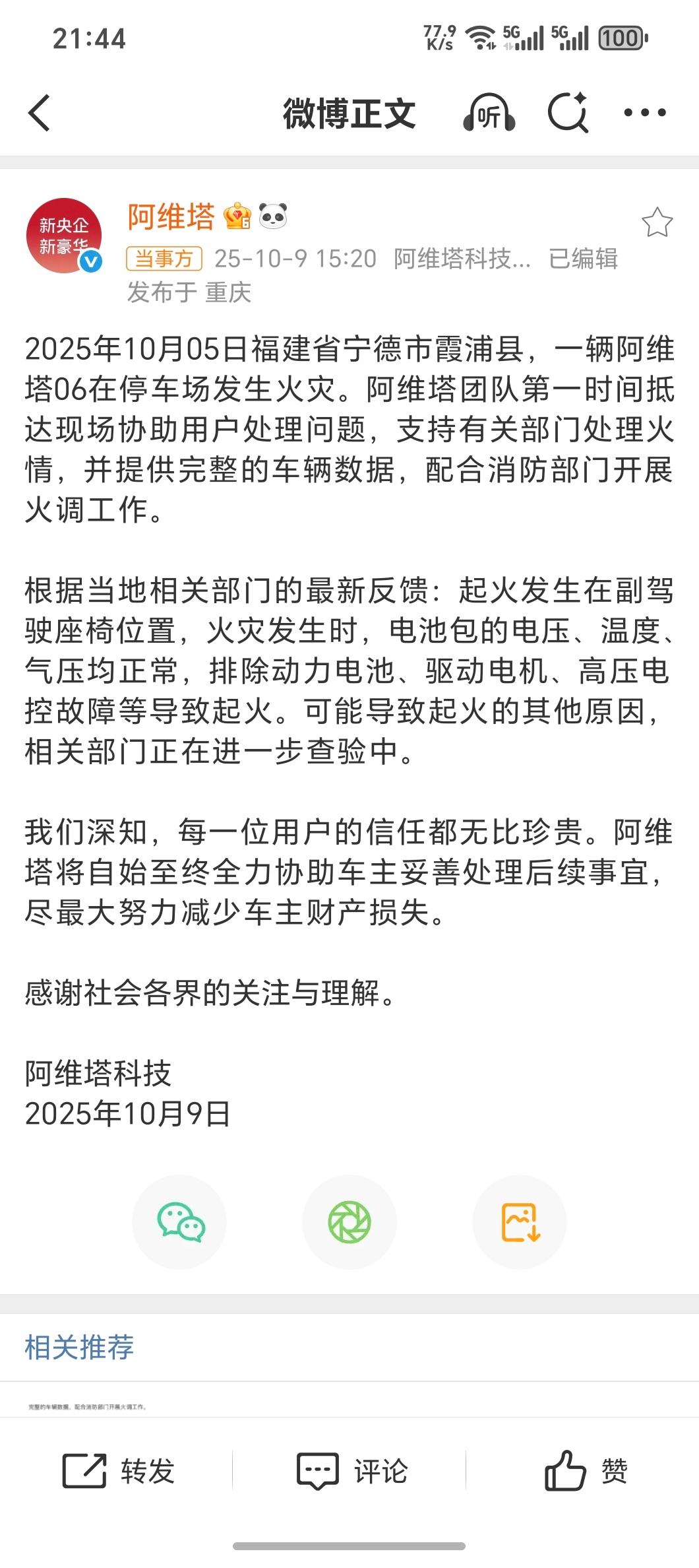 「起火发生在副驾驶座椅位置,火灾发生时,电池包的电压、温度、气压均正常,排除动力电池、驱动电机、高压电控故障等导致起火」