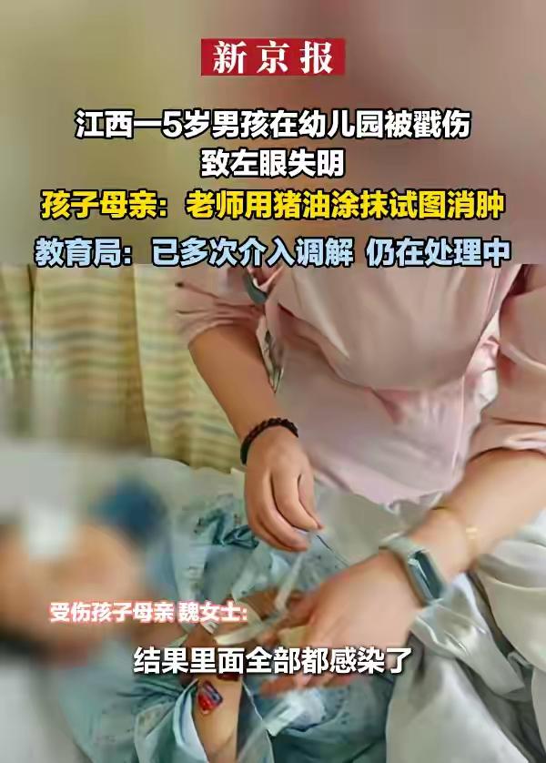 江西5岁男童失明:那勺猪油,戳痛了多少家长的心 江西瑞昌那则消息,光是读文字就让人手脚冰凉——5岁男孩在幼儿园被同学戳伤眼睛,老师看着房水流出来,竟拿猪油抹上去“消肿”,最终孩子左眼彻底失明。这哪是消肿,分明是把孩子推向了更深的深渊。 为人父母的都能懂魏女士的崩溃:“当场失明”四个字,砸碎的是孩子的一生。医生说孩子的眼角膜、虹膜、晶体全破了,两次手术换不回光明,未来还要反复开刀。更揪心的是,严重眼外伤可能引发交感性眼炎,另一只健康的眼睛也可能受牵连。272万医药费看似不少,可在终身治疗面前,不过是杯水车薪。 最让人愤怒的不是意外,是老师的无知与拖延。民间虽有用猪油处理淤青的说法,但那只适用于闭合性软组织损伤,眼球穿通伤用猪油,无异于主动引菌感染。《民法典》早有规定,无民事行为能力人在幼儿园受伤,园方要先证明自己无过错,可连最基本的应急处理都做反,园方的责任怎么摘得掉? “多次介入调解”的回应,更像一句苍白的托词。家长要的从来不是拉锯式的协商,而是孩子眼睛出问题时的及时救治,是园方对安全责任的真正敬畏。想想那些叮嘱孩子“铅笔别对着人”的家长,那些反复确认幼儿园监控是否完好的父母,谁不是在为孩子的安全揪着心? 这起悲剧从来不是“意外”那么简单。它藏着部分幼教从业者专业能力的缺失,藏着一些幼儿园安全管理的漏洞。希望魏女士的司法维权能有公正结果,更希望这勺猪油带来的教训,能让所有教育机构真正把孩子的安全放在首位。 你家孩子入园前,会特意确认老师的应急处理能力吗?欢迎在评论区说说你的担忧与做法。儿童眼睛伤残
