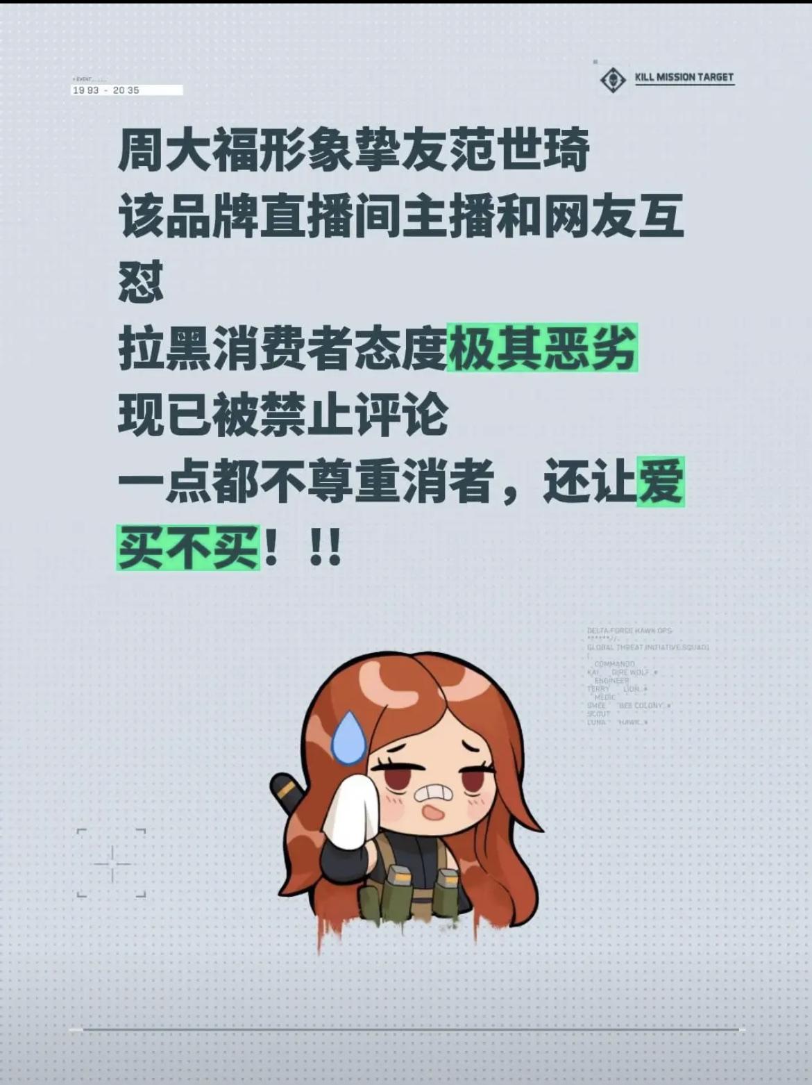 周大福形象挚友范世琦直播间与网友互怼,态度恶劣,甚至拉黑消费者。 现在直播间完全禁止评论!周大福做的真是太过分了,居然连消费者都不敢让你说话了,你们太不把消费者当回事了,消费者可是你们衣食父母啊,你们怎么这样不尊重消费者呢? 更何况消费者可不是你们老板的衣食父母吗?真是搞不懂你们老板的脑回路。 放话爱买不买,难道你们老板是打算做亏本生意吗?