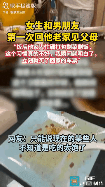 打包剩菜错了吗? 女孩和男朋友第一次回老家见父母,饭后男朋友家人打包剩菜,女孩看