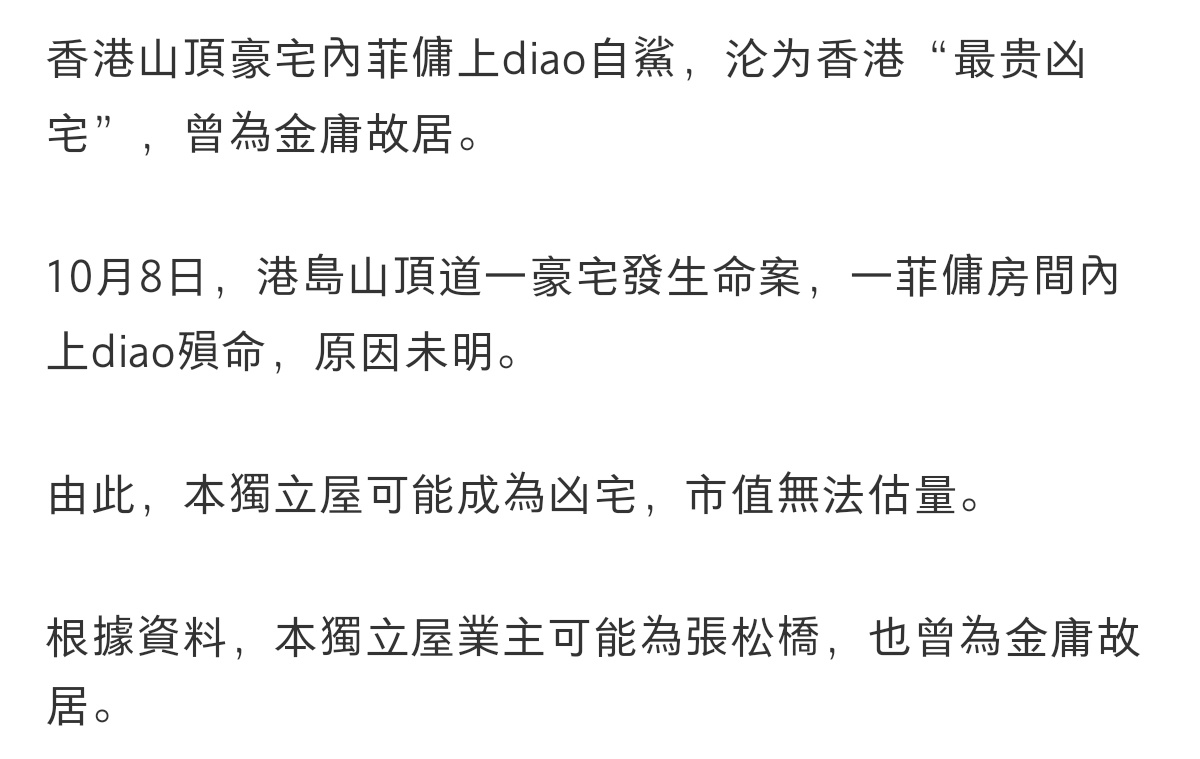 香港菲佣在雇主价值5.6亿港币的豪宅里上吊自鲨,估计雇主要膈应si了,这下超级豪宅变凶宅了。