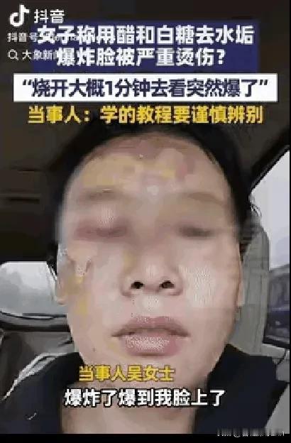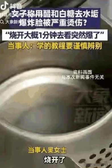 这下悲剧了!河北邯郸,一女子在家烧开水时,见保温壶里有很多水垢,就模仿“网络小妙招”去清理,将白糖和醋放进装有热水的壶里,几分钟后她想看下效果,不料,当她刚把脸凑近壶口时,里面的液体竟喷涌而出,将女子给烧个“面目全非”! 这位女子姓吴,今年42岁,是邯郸本地的一名家庭主妇,丈夫常年在外务工,家里大小事务都由她打理。她家的保温壶用了三年多,壶壁上的水垢积了厚厚一层,平时用钢丝球擦也擦不干净,看着总觉得不舒服。 前几天刷手机时,她刷到一条“一分钟除水垢”的短视频,里面说白糖加白醋烧开后倒进容器,水垢立马就能化掉,还配着水垢快速脱落的画面。吴女士想着这方法简单又省钱,当天烧开水时就动了尝试的念头。 她照着视频里的步骤,先在锅里把白醋、白糖和水混合烧开,趁热倒进了有水垢的保温壶。盖好壶盖等了大约一分钟,她估摸着时间差不多了,就端起保温壶,把脸凑到离壶口只有两厘米的地方,想看看水垢有没有真的掉下来。 没等她看清,壶内突然“嘣”的一声,滚烫的液体带着热气喷了出来,直接糊在了她脸上。吴女士疼得尖叫出声,双手下意识地去抹脸,反而把滚烫的液体抹得更开,家人听到动静跑过来时,她的脸颊和额头已经红肿起泡,连眼睛都快睁不开了。 送医后,医生诊断吴女士面部为二度烫伤,需要住院治疗,恢复期间还要格外注意防晒和护理,否则容易留下疤痕。躺在病床上的吴女士后悔不已,她后来才知道,自己犯了两个致命错误。 白醋里的醋酸本就会和水垢中的碳酸钙、氢氧化镁发生反应产生二氧化碳,她还把刚烧开的混合液倒进了密闭性极强的保温壶,高温让液体迅速产生大量水蒸气,两种气体在壶内积聚,压力越来越大,喷溅是必然的结果。 更没必要的是加白糖,这东西不仅对除水垢没帮助,还会增加液体的粘稠度,让气泡更容易积聚,反而加剧了喷溅的威力。合肥市第三十八中学的化学教师李杨后来解释,哪怕她能在倒进保温壶后静置5分钟冷却,气体产生速率减慢,也不会发生这样的意外。 吴女士的遭遇藏着一个普遍问题:现在网络上的“生活妙招”太多太杂,很多都是发布者随意拼凑的,根本没有科学依据。 就像除水垢,本来用白醋浸泡或小苏打煮沸就能解决,偏要加上白糖这类多余成分,纯粹是为了博眼球增加流量。这些内容往往只拍“效果”,不提风险,甚至故意省略关键的安全步骤,比如冷却、通风、避免密闭。用户看的时候只觉得方便,根本想不到背后藏着隐患。 平台在这件事里也有不可推卸的责任。虽然像抖音这样的平台在打击水军、欺诈等黑产上花了力气,日均能拦截数百万条违规信息,但在生活技巧类内容的审核上显然还有漏洞。 国家广播电视总局早就要求网络平台落实“总编辑内容负责制”,对上线内容进行审核把关,可大量未经验证的“小妙招”还是能轻易刷到。这些内容不像低俗视频那样容易识别,却可能带来实实在在的人身伤害,更需要精准审核和风险提示。 其实清理水垢的安全方法并不复杂。 用白醋和水按1:2的比例混合,倒进容器煮沸后关火焖两三个小时,水垢自然会软化脱落;不锈钢水壶可以直接泡一夜,效果更好。嫌白醋味道大,用小苏打或者纯碱也行,加水煮沸后静置一小时,同样能溶解水垢。 实在不想用化学方法,还有物理办法,把水壶烧热后迅速浇凉水,重复几次,水垢会因热胀冷缩自行脱落。平时烧水时加少量小苏打,还能提前沉淀水中的矿物质,减少水垢生成。 这件事给所有人敲了警钟:网络信息不是越“新奇”越“管用”。那些看似省事的技巧,往往藏着看不见的风险。 面对五花八门的网络内容,多一份质疑,多查一下科学依据,远比盲目跟风更重要。平台也该加强对生活类内容的审核,对没有科学支撑、存在安全隐患的内容及时下架,而不是任由其传播。 安全从来不是小事,哪怕是清理水垢这样的家务,也容不得半点马虎。别让图方便的念头,变成追悔莫及的伤害。 各位读者你们怎么看?欢迎在评论区讨论。