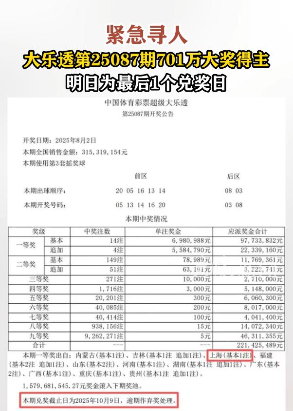 “这就是命啊!”10月9日,上海,一彩民花了42元买了一张大乐透彩票,谁知却意外中了一等奖,奖金高达701万元,然而如今2个月过去了,眼看着已经到了最后一天兑奖期,彩民却迟迟不现身!网友:要是我中了彩票,连一天晚上都等不及。 2025年10月9日上海福彩中心门口,工作人员反复核对兑奖系统,屏幕上“701万一等奖未兑奖”的提示格外刺眼。 距离兑奖截止只剩最后1小时,中奖彩民仍未现身,这张42元的“7+2”复式票,正朝着“弃奖”的方向滑去。 门口围满记者,有人举着相机追问“还能等吗”,工作人员摇头:“规则就是60天,国庆假期已顺延,没辙。” 这张彩票的故事,要从8月2日开奖那天说起。 上海奉贤区的彩票站老板老周,像往常一样核对中奖号码,突然拍着桌子站起来:“咱这儿出一等奖了!701万!” 他赶紧翻出销售记录,查到是一位熟客买的“7+2”复式票,42元,开奖前一天傍晚买的,没留联系方式。 老周守在店里等了三天,没见这位熟客来,他急得在朋友圈发消息,又怕泄露信息,只敢说“有顾客中了奖,速来核对”,可始终没动静。 8月中旬,福彩中心开始通过媒体寻人。 电视、报纸都登了消息:“上海奉贤区8月1日售出的大乐透一等奖,兑奖期剩45天,请得主尽快兑奖。” 评论区里,网友炸开了锅,有人说“要是我,当天就去兑奖了”,有人猜“是不是彩票丢了”,还有人调侃“得主是不是忘了买过彩票”。 老周也天天盯着门口,有熟客来买烟,他就忍不住问:“你8月初买的彩票核对了吗?咱这儿出了大奖。” 有位顾客拍着大腿说:“我那天好像也买了,回家找找!”结果第二天来说“找不着了”,让老周空欢喜一场。 9月底,离兑奖截止只剩10天,福彩中心又加了寻人力度。 他们公布了彩票站的大致位置,没说具体店名,怕有人冒领。 老周店里的电话快被打爆了,有问地址的,有说自己可能中奖的,还有媒体来采访。 老周对着镜头说:“那位顾客每次来都挺随意的,买完票揣兜里就走,说不定真忘了。” 有天晚上,店里快关门时,一位大叔急冲冲跑来,掏出一沓彩票:“老板,你帮我对对,我8月初在这儿买过!” 老周一张张核对,最后摇着头说:“不是这张,中奖的是‘7+2’复式票。”大叔叹了口气,失望地走了。 10月1日国庆假期开始,兑奖窗口关闭,老周更急了。 他怕那位顾客以为假期能兑奖,等上班了再去,就错过最后期限。 他特意在店门口贴了告示:“国庆期间不兑奖,兑奖截止10月9日,请中奖顾客尽快前往福彩中心!” 假期里,有位女士来买彩票,看到告示问:“真有人中了700多万还不领啊?” 老周说:“是啊,我天天盼着他来,这钱要是弃奖了,多可惜。” 女士摇摇头:“要是我,晚上都睡不着觉,早把家翻遍找彩票了。” 10月9日当天,福彩中心的兑奖窗口一早就开了。 工作人员提前准备好核对设备,还特意留了专人接待。 从早上8点到下午4点,来兑奖的人不少,可都不是那注一等奖的得主。 下午4点半,离截止只剩半小时,门口的记者还在等,有人已经开始写“701万大奖将弃奖”的稿子。 下午5点整,兑奖系统准时关闭,那张42元的彩票最终成了弃奖。 福彩中心工作人员无奈地说:“这是今年上海最大的一笔弃奖,奖金会纳入公益金,用于扶老、助残等项目。” 老周得知消息后,坐在店里愣了半天:“怎么就忘了呢?这可是700多万啊。” 网友们在评论区炸开了锅,有人说“太可惜了,这就是命”,有人说“说不定是彩票丢了,得主现在还在哭”,还有人调侃“以后买了彩票,我得贴在手机壳上”。 如今,老周的彩票站里,还贴着那张“寻人告示”,只是旁边多了一行字:“请妥善保管彩票,及时核对开奖信息。” 有顾客来买彩,老周总会多叮嘱一句:“买完记着放好,开奖后赶紧对,别像上次那位,700多万都错过了。” 偶尔有人问起那位没现身的得主,老周只能摇摇头:“谁知道呢?可能是真忘了,也可能是丢了,总之太可惜了。” 而那笔701万的奖金,已经纳入公益金,开始用于各种公益项目,只是每次提到这笔钱,人们总会想起那个“最糊涂的彩民”,忍不住叹一句“这就是命啊”。 信息来源:《上海701万彩票大奖仅剩1个兑奖日:得主尚未现身 体彩中心发寻人信息》大皖新闻