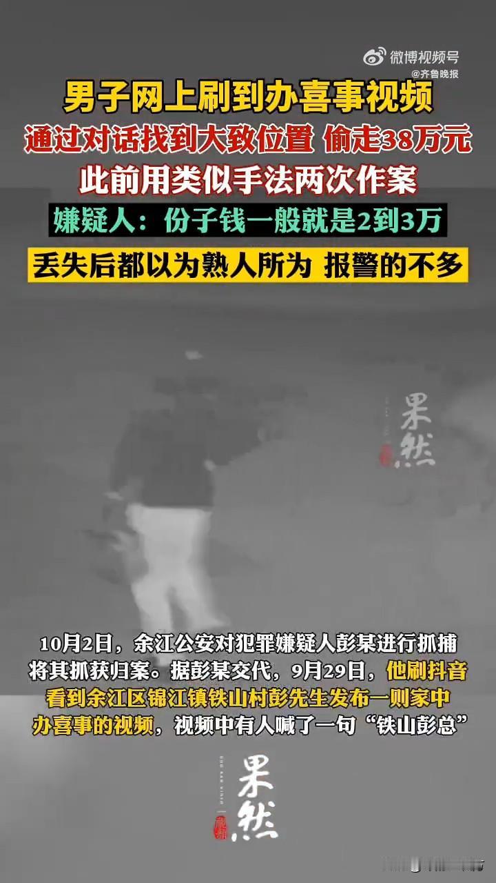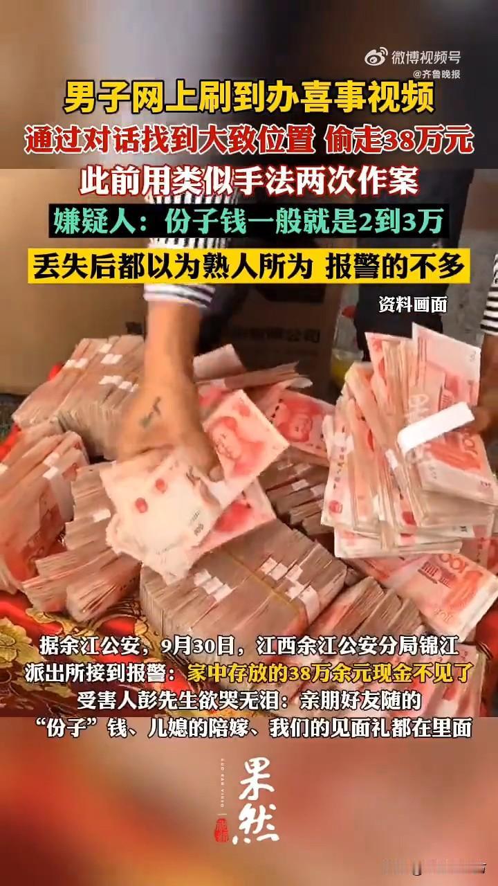 来自小偷的救赎:打开箱子那一刻我就知道我栽了! 一男子家中办喜事,在社交平台晒礼金,结果被小偷发现并找到他们家,偷偷顺走38万礼金! 这事听着挺玄乎,可却是真实发生的,谨记啊,财不露白! 这小偷也算是有点才,居然可以通过视频找到办喜事本家!可惜了,才情没用在正道!