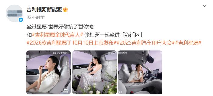 今晚让我们一起和吉利星愿全球代言人张柏芝一起坐进“舒适区” 2026款吉利星愿于10月10日上市发布 2025吉利汽车用户大会