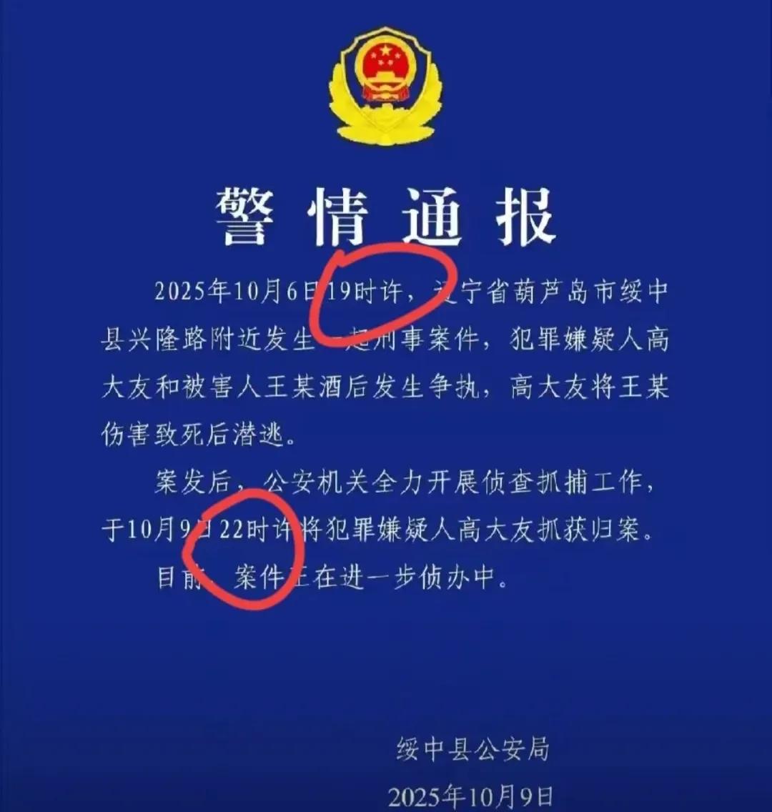 高大友被抓住了,跑了3天,晚上10点左右被抓,当地网友透露,在隔壁7、80公里的兴城市,可见没跑远,穿着短袖、拖鞋,天这么冷,荒郊野外也去不了,被抓时穿了一件,蓝色、黄色相间的运动衫外套,起码暖和点,看高大友状态,比网传照片憔悴了,显年纪大,不像44岁,像54岁,可是没有那种凶猛恶煞的劲了,像老实庄稼汉、农民工,事发晚上7点,通报证实与王某酒后争执,都是被酒害了! 从网友描述看,高大友逃跑期间条件艰苦,短袖拖鞋在寒冷天气中难以支撑,最终换上外套,状态明显下滑。这反映出逃亡者的普遍困境——物质匮乏、精神紧张,身体和心理迅速被消耗,与影视剧中“潇洒逃亡”的形象大相径庭。 通报中“酒后争执”是关键诱因。数据显示,我国因酒后冲突引发的刑事案件占比超三成,酒精降低判断力,放大情绪,往往成为悲剧导火索。高大友从“凶猛”到“憔悴”的转变,也印证了冲动行为后的代价——不仅逃不过法律,更毁了自己。 酒不是“凶器”,管不住自己才是。逃亡三天换不来自由,只换来憔悴和法律制裁。与其事后后悔,不如事前控制。毕竟,成年人的世界,没有“喝醉”的借口,只有“负责”的底线。