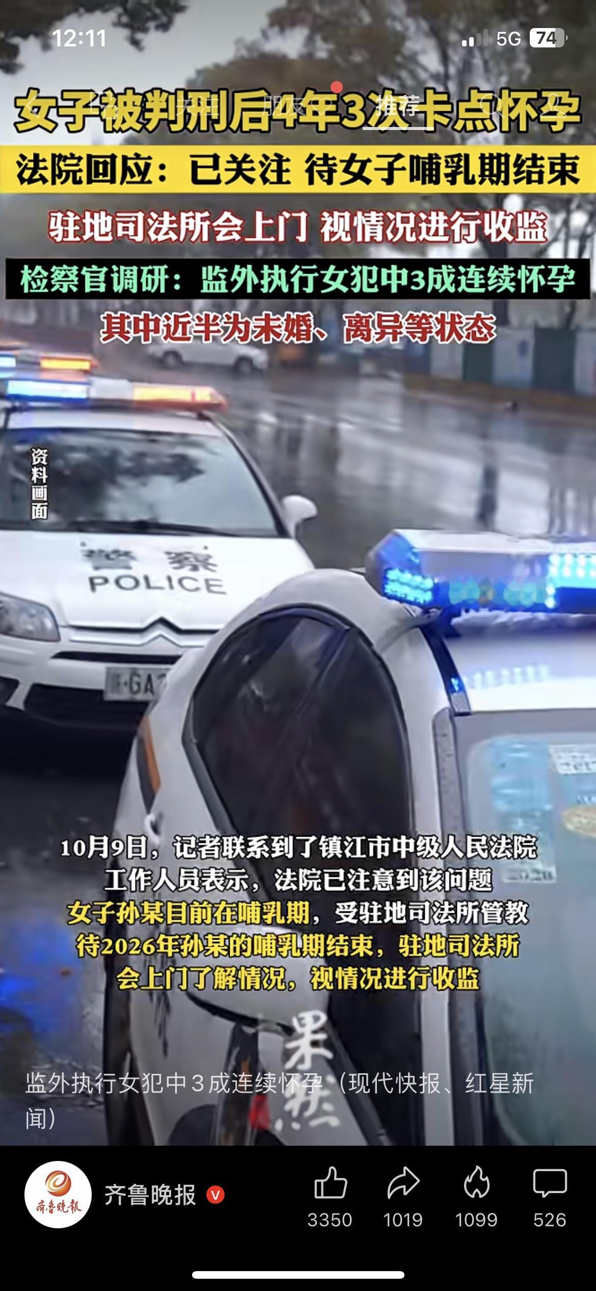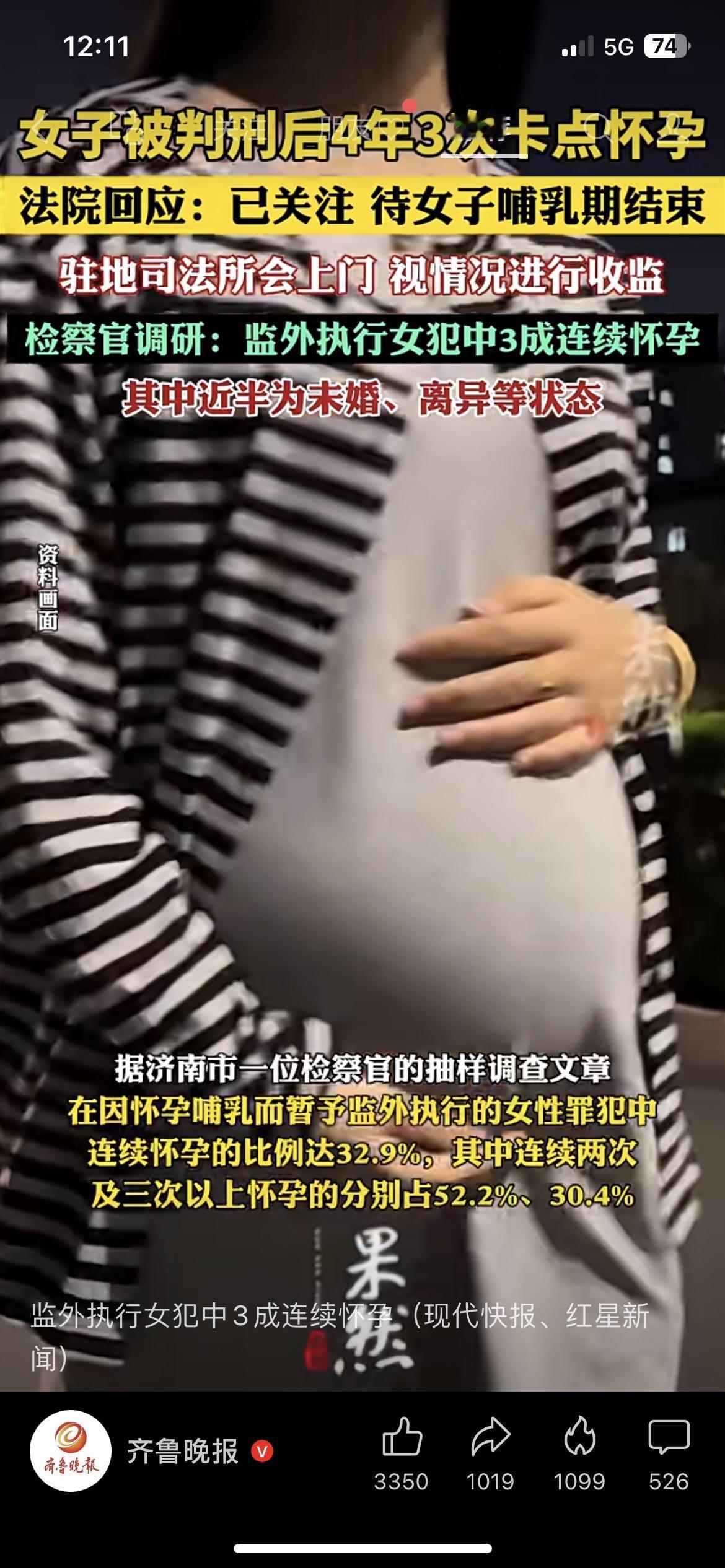 离谱!女子判刑后4年3次卡点怀孕逃避收监,法院最新回应来了 江苏一女子被判3年半,却4年内连生3胎,一直没进监狱! 10月9日,镇江市中级人民法院回应:女子孙某目前在哺乳期,受司法所管教,等2026年哺乳期结束,司法所将上门视情况收监。 更让人震惊的是,检察官调研发现: • 监外执行女犯中,3成连续怀孕; • 近半是未婚、离异状态,甚至有人用非法胚胎移植等手段怀孕! 这操作,你怎么看?评论区聊聊~ 热点 法律 社会新闻 女人坐监狱 孕期遭解雇 入监服刑 服刑管理