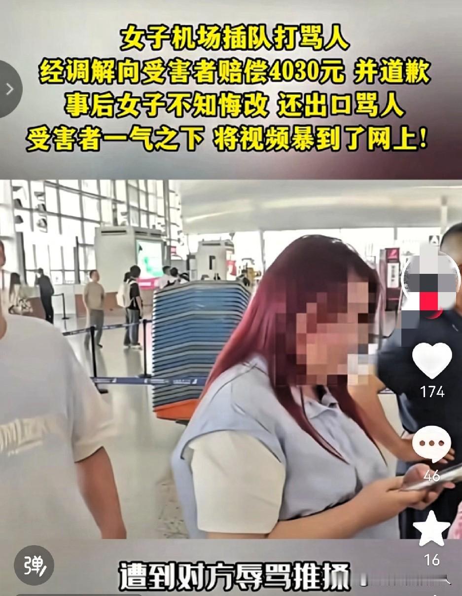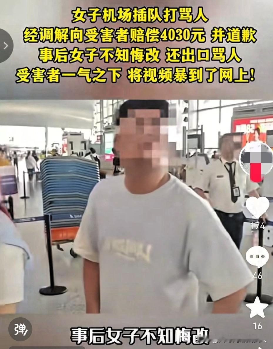男子在南京机场被女子扇耳光后续,警方介入,女子听到赔钱被吓哭? 国庆假期结束,很多朋友都开始返程了。 在路上的时候,偶然间看到了一个视频,大概是发生在南京禄口机场的一个插队事件, 视频中的戴先生和他的家人在排队过安检的时候,一家四口的插队行为让戴先生和家人很气愤。 戴先生轻声劝阻后,对方竟然破口大骂,没想到女子竟然扇了戴先生两个耳光。 戴先生气报了警,警察赶到后,对女子进行了调查。经警方调查,戴先生没有插队行为,而女子打人行为属实。最终判定女子赔偿戴先生4030元。 戴先生和女子两方进行了调解。没想到女子因为要赔偿这么多钱而哭了。 网友看完事件经过,都表示十分气愤! 骂人的、打人的,轻轻的赔偿一下就算完了,以后还有人敢插队吗? 法律不罚款不拘留,这么轻松的后果,怎么能让人记住公共场合的规矩? 如果女子非要骂人、打人,法律也只能判她赔偿。如果赔偿的数额太小了,怎么能提醒到别人呢? 不怕插队的,以后就继续插队,不怕打人的,以后就继续打人。 戴先生遇冲突不还手、及时报警,是理性维权范本。这能鼓励更多人遇侵权时走合法途径,而非以暴制暴,推动公共秩序良性循环。 事件就是发生在公共场合,但是现在很多人的公共场合意识淡薄,插队现象屡见不鲜!