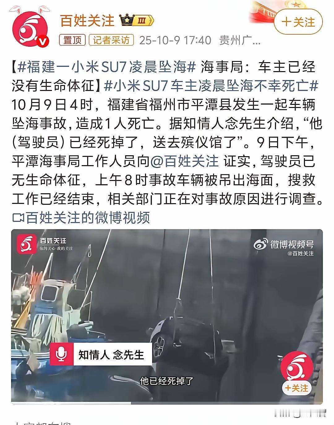 10月9日4时,一辆小米SU7坠海,车主被困身亡! 这起事故有点诡异啊,车斜着朝