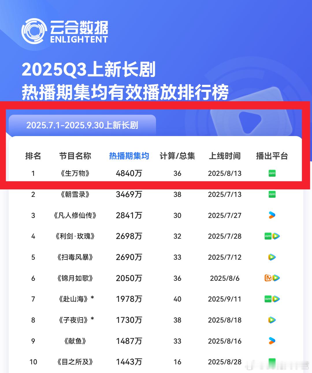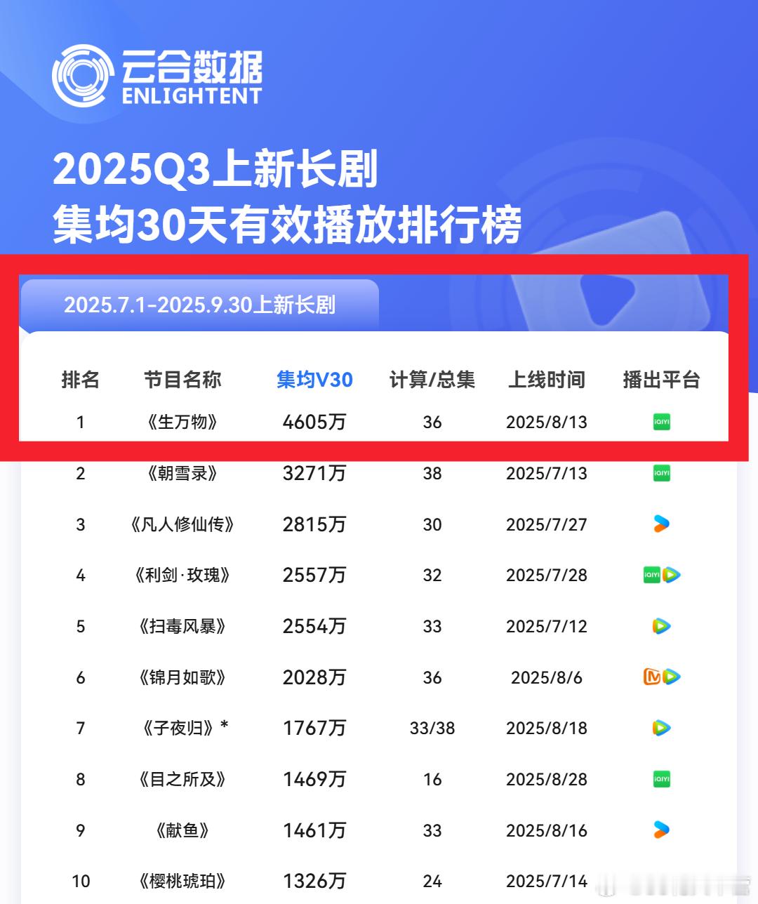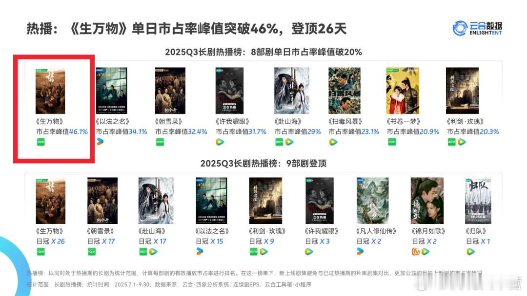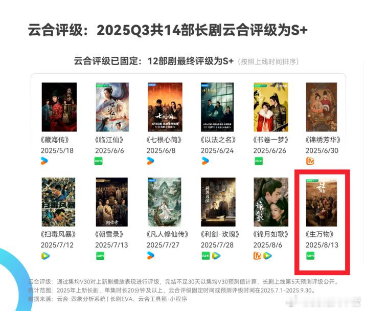 云合2025第三季度长剧数据排行榜——S+《生万物》