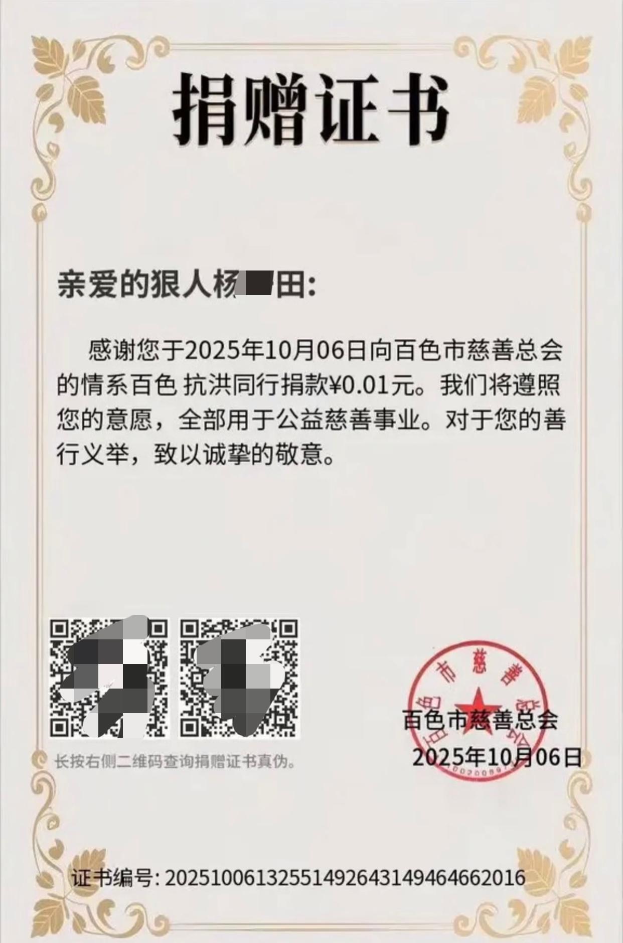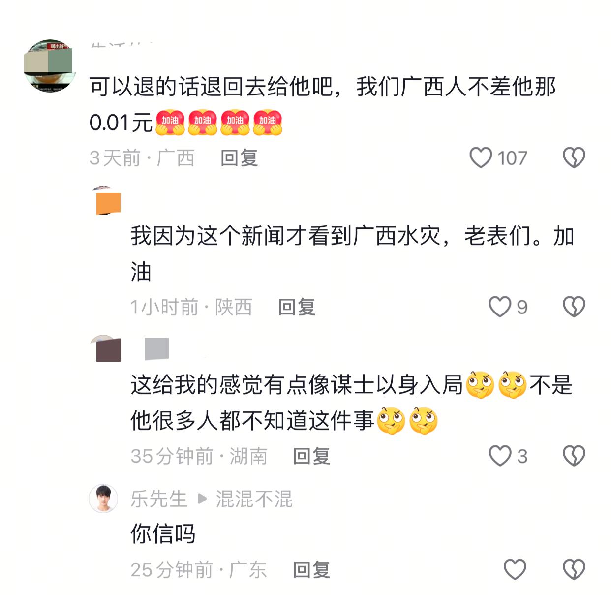 23万粉丝的“狠人”为广西水灾捐1分钱,还把捐款证明发了出来,百色慈善总会在采访中大气表示一分钱也是善意,但网友分成了两派:一部分人表示经济困难可以不捐,拿1分钱是一种侮辱,另一部分截然相反,认为这位“狠人杨某田”是在以身入局,目的就是让更多人关注广西水灾,无论是故意拿捐款拍段子还是真在做贡献,目前确实让更多人知道广西水灾,从这一点出发也不是坏事。