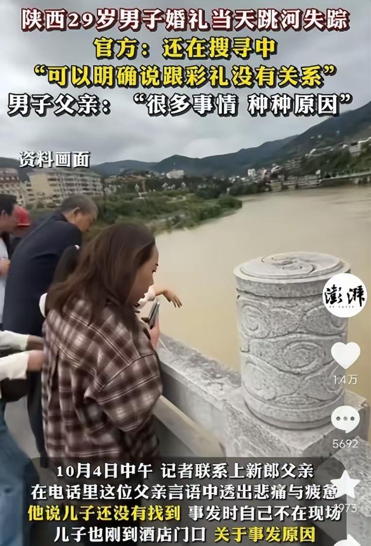 婚礼当天新郎穿定制婚服跳河,5天后找到人,女方一句“尽快来”引全网吵翻 家人们,陕西这场婚礼闹剧太揪心了。29岁的新郎小周,婚礼当天穿着婚服跳河,失踪了好几天,终于在9号被找到了。 10月3号是小周的大喜日子。他和女方小李相恋多年,在酒店摆了几十桌宴席。亲友们一大早就来帮忙筹备,10点钟左右,小周还没有出来迎接宾客,看着挺正常。 可婚礼还没有正式开始,小周突然崩溃跑出酒店。他冲到附近河边,路人还以为他只是紧张想透透气。还没等路人反应,他就纵身跳进了河里,很快被河水冲走,没了踪影。 河水又急又浑,还连着下了几天雨。救援人员找了好几天,都没有确定小周的位置。小周父母急坏了,好不容易盼到儿子结婚,却出了这种事。 网上传得特别乱。有人说因为彩礼,有人说女方要下车费,甚至还有人说小周妈妈跟着跳河了。官方很快出来辟谣,说这些都不是真的,还严惩了造谣的人。小周爸爸只是说“很多事情,种种原因”,没有过多解释。 9号上午,有市民在河里发现了小周的遗体。他还穿着那件定制婚服,救援人员通过衣服上的名字,确认了就是他。小周妈妈的精神状态很差,家里人不敢让她见孩子。 女方这边说会尽快来看小周,这话一出,网友都议论开了。大家觉得,这个时候还有比来看小周更要紧的事吗?好歹应该去安慰下小周父母吧。 好好的婚礼变成丧事,谁都不想看到。年轻人压力大可以理解,但真不该用这么极端的方式。一条命没了,留下父母一辈子的痛。你们觉得这事到底是因为啥?新郎跳河 陕西新郎跳河 婚礼前新郎跳河 新娘跳河 婚礼小伙跳河 婚礼跳河 新郎新婚前跳河 婚礼前跳河 信息来源:极目新闻
