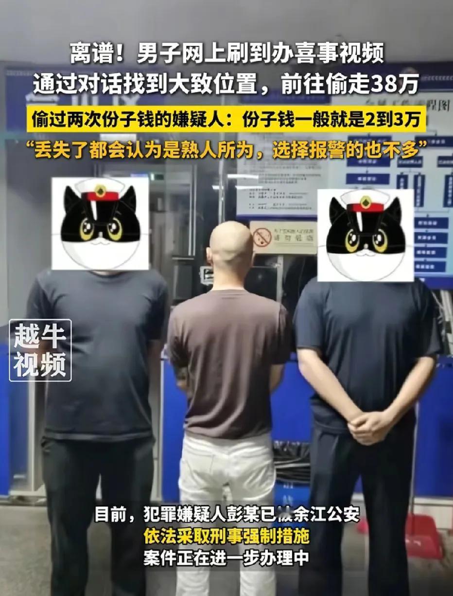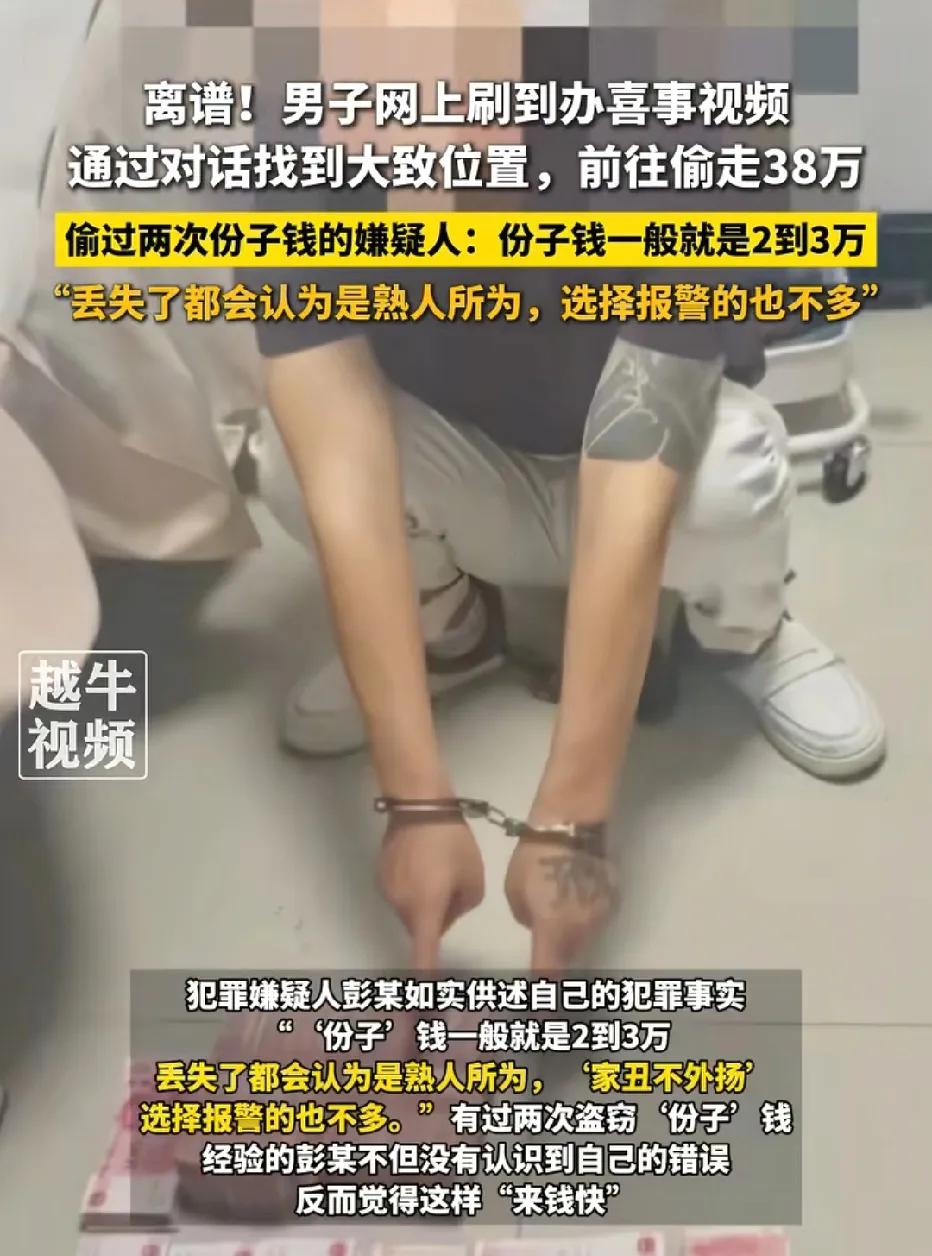 江西余江,男子家里办喜事,他太高兴了,把38万元礼金拍下发到网上炫耀,还附带了定位,没想到,男子露富的视频引起了小偷注意,根据位置,小偷直接去到现场,将38万礼金连带箱子也跟着偷走了。男子发现现金不翼而飞,立马报警。而小偷的话让人不得不提防。 彭某正为儿子的婚礼忙得脚不沾地。 亲友们围着红桌道贺,有人举着酒杯高声喊“恭喜铁山彭总”,他笑得合不拢嘴。 人逢喜事精神爽,彭某看着桌上刚清点好的38万礼金,还有女方带来的嫁妆,他一时兴起,掏出手机就拍。 镜头扫过码得整齐的现金,又对着门口的“囍”字晃了晃,随手发了条朋友圈,不仅配文“感谢大家,沾沾喜气!”,还直接附上了婚宴现场的定位。 事后回想起来,彭某满是后怕:要是当初没把这段视频发上网炫耀,根本不会出这么大的事。 可世上没有后悔药,9月30日,当他准备把礼金收进里屋时,却发现装钱的红色行李箱不翼而飞。 桌角空荡荡的,连一点现金的影子都没剩,他瞬间懵了,钱到底什么时候不见的、被谁偷的,他一概不知。 只能急得拍着大腿喊人,原本喧闹的屋子瞬间陷入死寂,反应过来后,彭某手抖着拨通了报警电话。 在场的人也都慌了神,纷纷猜测是谁这么明目张胆。 民警调取监控时,所有人都倒吸一口凉气: 画面里,一名穿深色外套的陌生男子,揣着手在院外晃了两圈,眼神直勾勾盯着彭某放礼金的房间,趁没人注意,拎起箱子就快步溜走,动作熟稔得像早就踩好了点。 不到24小时,民警就在邻县的一家小旅馆抓获了这名小偷。 核查身份时,更惊人的细节浮出水面:该男子根本不是第一次作案,此前就因两次上门踩点盗窃份子钱。 他尤其擅长盯着家里办大事、人员杂乱的场景下手,专挑主人疏忽的间隙作案,每次只偷1-2万。 在他看来,人家丢了这点钱,大概率会以为是熟人干的,为了面子,都不会报警,所以这次才敢如此大胆妄为。 可他偷了两次,却始终没意识到自己早已触犯法律红线,还觉得这种来钱方式很快。 听完小偷这番话,彭某又懊悔又后怕,连连说以后再也不露富了。 那么,从法律角度看,该如何看待这件事呢? 《刑法》第264条规定:盗窃罪是指以非法占有为目的,盗窃公私财物数额较大、多次盗窃、入户盗窃、携带凶器盗窃、扒窃的行为。 小偷的行为已构成盗窃罪,且属情节严重。 《刑法》第264条规定:盗窃公私财物,数额较大的,或者多次盗窃、入户盗窃、携带凶器盗窃、扒窃的,处三年以下有期徒刑、拘役或者管制,并处或者单处罚金;数额巨大或者有其他严重情节的,处三年以上十年以下有期徒刑,并处罚金;数额特别巨大或者有其他特别严重情节的,处十年以上有期徒刑或者无期徒刑,并处罚金或者没收财产。 彭某被盗的38万元礼金,远超过盗窃罪数额特别巨大(通常为30万元以上)的标准。 小偷此前已有两次上门盗窃的前科,此次属于多次盗窃,应依法从重处罚。量刑起点即达10年以上有期徒刑或无期徒刑,并处没收财产。 最后,财不露白,做事都要低调一点,这样才不会引起不必要的麻烦。 对此,你怎么看?
