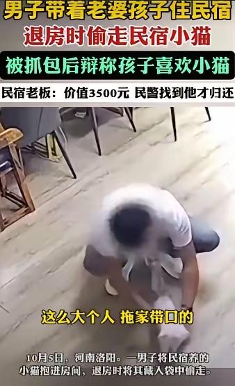 河南洛阳,男子一家三口住民宿,临走时,将民宿一只价值3500元的猫偷走,老板发现后联系男子却被拉黑,一怒之下报了警,没想到,男子让老板去高速口接猫,接下来,男子一句话给人气无语了!网友:上梁不正下梁歪。 河南洛阳民宿的后院里,马女士蹲在地上,慢慢打开那个沾着灰尘的塑料笼。 你都不知道马女士看到猫的时候多心疼——笼里的布偶猫叫“糯米”,右眼睛红得像肿了,爪子上还沾着高速路边的黄土,见了马女士伸过去的手,居然往角落缩了缩。这猫是马女士去年冬天在小区楼下救的流浪猫,当时冻得快没气了,她天天喂羊奶粉才救回来,养了一年多才敢让人靠近,客人住店时她还特意叮嘱“糯米怕生,别随便抱”,哪成想客人转头就把猫装笼带走了。 之前调监控的时候,马女士看得清清楚楚:男子一家收拾行李时,他老婆抱着孩子在旁边等,他自己蹲在猫窝前逗了糯米两下,见猫不反抗,直接抱起来塞进了后备箱的塑料笼里。马女士第一时间打他电话,响了两声就被拉黑,微信消息也发不出去——那时候她还抱着一丝希望,觉得对方可能是“一时糊涂”,直到民警联系上男子,对方才不情不愿地说“可以送回来,但得去20公里外的高速口接”。 马女士开着车往高速口赶,越想越委屈,眼泪好几次差点掉下来。到了约定的地方,远远就看见一辆白色轿车停在路边,车窗降下,男子探出头,手里拎着那个塑料笼,副驾上还坐着他儿子,孩子手里攥着之前在民宿玩过的玩具车,正好奇地盯着马女士。“喏,猫给你,”男子把笼子往路边一放,语气特别不耐烦,“不就一只猫吗?还至于报警?我儿子喜欢,我就带回去玩两天,现在送回来还不依不饶的,多大点事儿啊!” 这话一出口,马女士瞬间就气懵了。她指着笼子里的糯米,声音都在抖:“这猫是我救回来的,你说拿就拿?它现在眼睛肿了,你知道它一路上多害怕吗?”男子却翻了个白眼,拉上车窗就想走,副驾的孩子还对着马女士挥了挥玩具车,好像觉得这事儿特别有意思。要不是民警后来赶过来,马女士说她真想拦住对方理论——她不是心疼猫值多少钱,是气这家人把“偷东西”当成“小事”,还在孩子面前这么理直气壮。 民警后来跟马女士说,按照《治安管理处罚法》,男子这种行为已经涉嫌盗窃,就算把猫送回来,也得面临罚款。可马女士更在意的是孩子的反应:“他爸觉得偷猫不算错,孩子看在眼里,以后会不会觉得‘喜欢的东西就能随便拿’?”网友看到这段经过,更是炸了锅,有人说“上梁不正下梁歪,家长这么做,孩子能学好才怪”,还有人说“别拿‘孩子喜欢’当借口,偷就是偷,哪来的理”。 其实这事儿哪是“一只猫”的问题?是有些人把“规则”当摆设,把“自私”当理所当然。你住民宿,享受了人家的服务,却偷偷带走别人的宠物,还觉得“小题大做”——这种态度,比偷猫本身更让人寒心。尤其是在孩子面前,家长的每一个举动都是榜样,今天你觉得“拿只猫没事”,明天孩子可能就会觉得“拿别人的东西也没事”,这才是最可怕的。 各位读者你们怎么看?欢迎在评论区讨论。