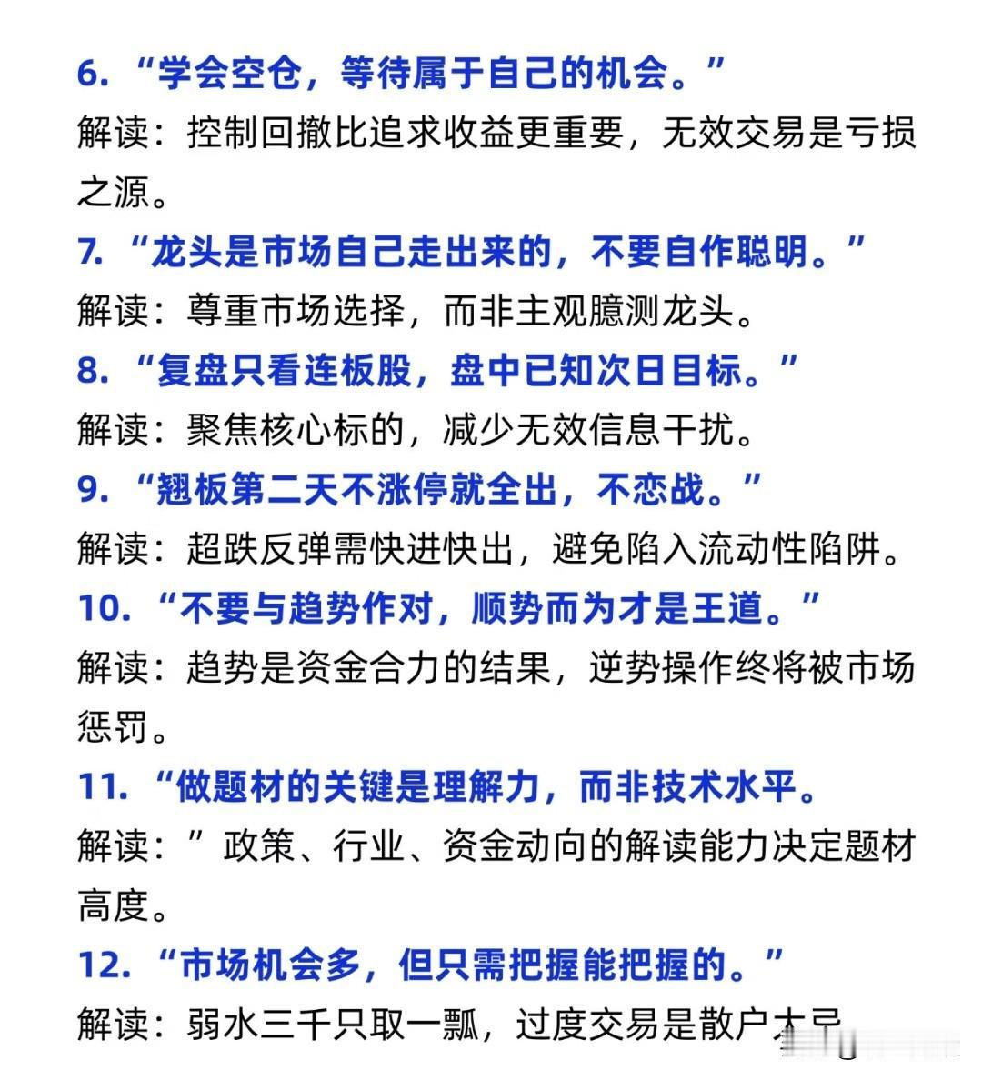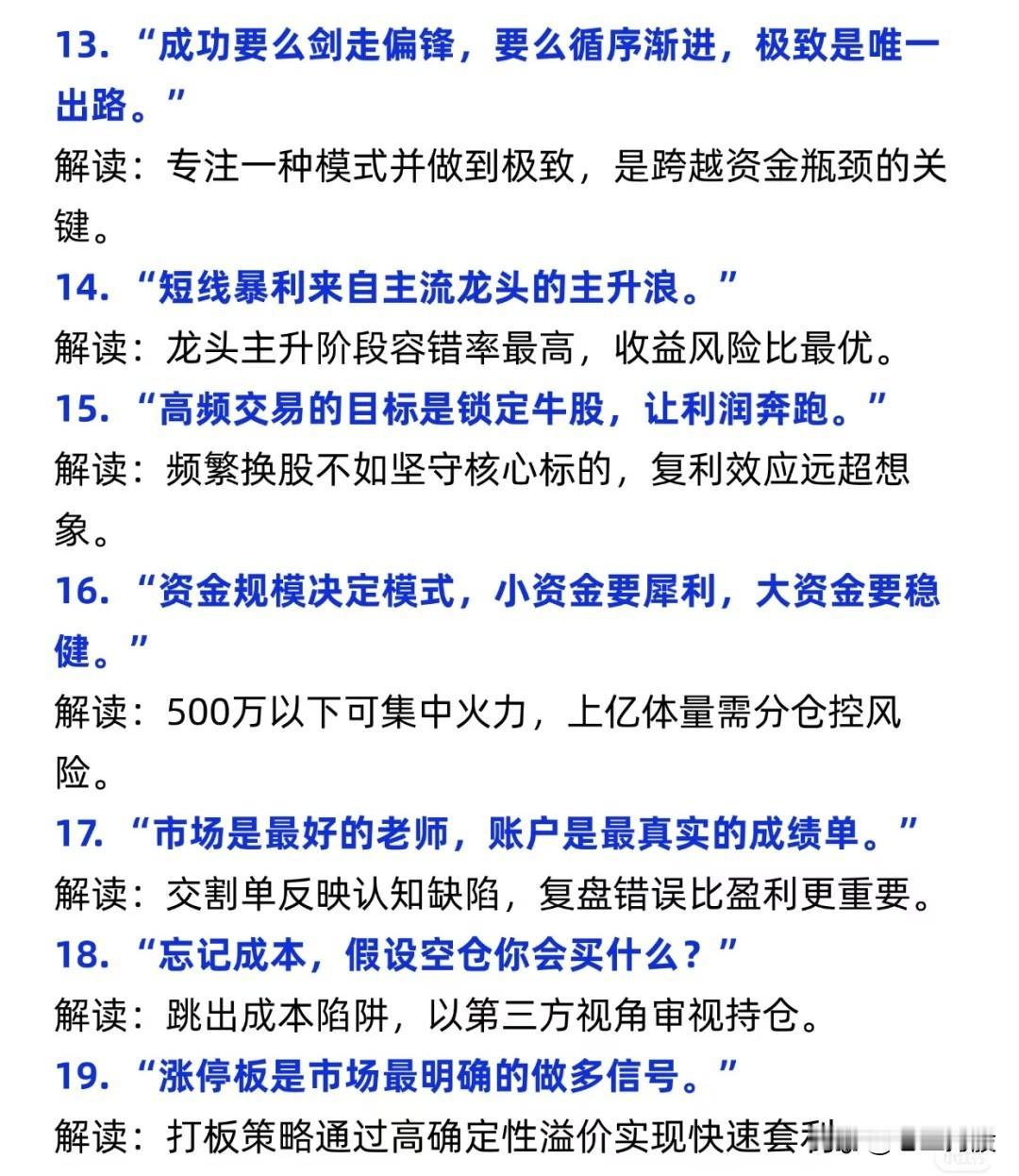 顶级游资投资语录与策略总结 一、核心语录(1-5条) 1. 永不止损/盈,只管进出 → 盈亏看市场信号,非成本。 2. 龙头买卖法则 → 高手买龙头,超级高手卖龙头(情绪高点离场)。 3. 龙头确认 → 二板定龙头,首板难辨。 4. 题材选择 → 抛弃旧题材,追逐新故事。 5. 人气=成交量 → 无量上涨易崩塌。 二、实战策略(6-12条) 6. 空仓等待 → 控制回撤>盲目交易。 7. 尊重市场 → 龙头由市场选出,非主观臆断。 8. 聚焦连板股 → 复盘锁定次日目标,减少噪音。 9. 翘板快出 → 第二天不涨停即离场,防陷阱。 10. 顺势而为 → 逆势必被惩罚。 11. 题材理解力>技术 → 政策/行业/资金解读决定高度。 12. 弱水三千取一瓢 → 过度交易是大忌。 三、投资原则(13-19条) 13. 极致专注 → 剑走偏锋或循序渐进,模式做到极致。 14. 龙头主升浪 → 短线暴利核心来源。 15. 高频交易 → 锁定牛股,让利润奔跑(复利>频繁换股)。 16. 资金适配模式 → 小资金集中火力,大资金分仓控险。 17. 账户即成绩单 → 交割单暴露认知缺陷,复盘错误更重要。 18. 忘掉成本 → 第三方视角决策持仓。 19. 涨停板信号 → 打板=高确定性套利。 核心逻辑:聚焦龙头、尊重市场、严控回撤、极致专注,量能与趋势为王。