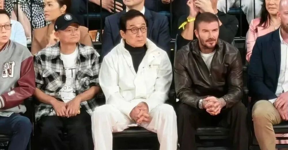 马云身着休闲装,头戴棒球帽,身旁坐着成龙、贝克汉姆等知名巨星。现场还有姚明、奥尼尔、林书豪、梁朝伟刘嘉玲夫妇、梁咏琪等众多娱乐以及体育界人士。