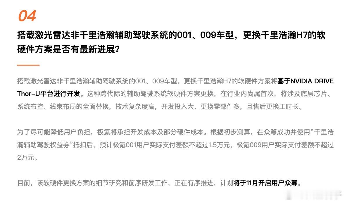 而且极氪自己也承担很多成本,估算了一下,在众筹成功并使用“千里浩瀚辅助驾驶权益券”抵扣后,预计极氪001用户实际支付差额不超过1.5万元,极氪009用户实际支付差额不超过2万元。