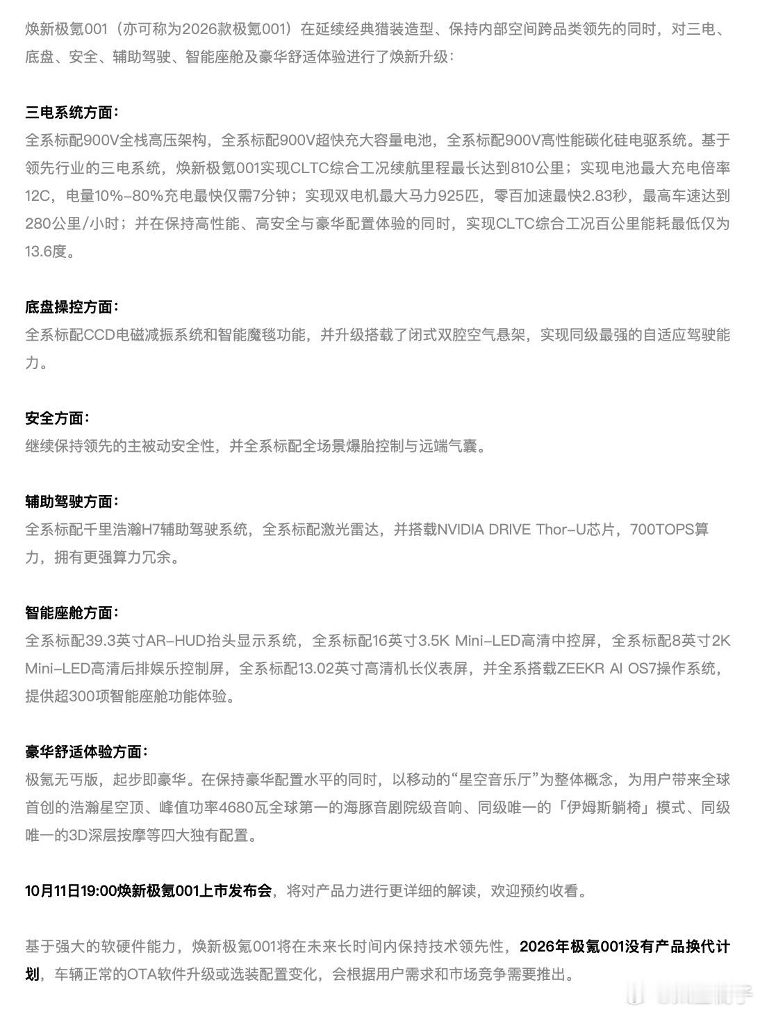 1、今晚发布的新款极氪001,就是2026款;在2026年,不会有任何的改款计划。