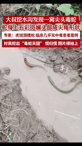 “幸亏跑得快!”青岛一大叔挖水沟,一铲子下去,竟然从土里钻出来一条“大长虫”,还有一窝尖头毒蛇,蛇身上五彩斑斓,头 部成尖角形状,确定是毒蛇!专家表示:系本地红脖颈槽蛇,虽然是毒蛇,但毒性不是很强! 大叔说,当时挖了快半米深,一铲子下去碰着软乎乎的东西,还以为是粗树根,结果窜出条胳膊粗的三角头蛇,后面还跟着一群小蛇,吓得他铁锹都扔了,连退两大步! 这蛇看着花里胡哨,其实是本地常见的红脖颈槽蛇,别看专家说毒性不算“剧毒”,被咬了照样红肿头晕,必须赶紧去医院打血清。 而且它还是“三有保护动物”,网上都叫它“牢底坐穿蛇”,故意打死一条可能罚2000到1万,多了还得坐牢,就算不小心弄死都可能被追责。 我觉得大伙别纠结它毒强不强,重点是这蛇又危险又碰不得。 遇到了别想着打或抓,赶紧躲远,避免被咬还违法,尽快联系林业部门或消防,让专业的人来处理对对。 你们见过这种蛇吗?