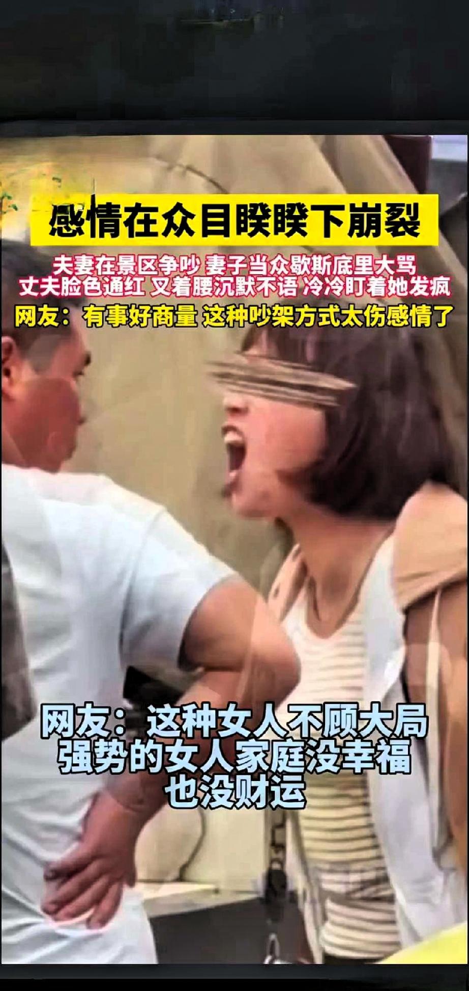 一对夫妻在景区内吵架,妻子歇斯底里,指着丈夫的鼻子骂,从柴米油盐数落到人情往来,声音大得能盖过游客的喧闹。丈夫呢?双手叉腰钉在原地,脸憋得通红,却半个字不反驳,就用那种冷冰冰的眼神盯着她,像在看一个陌生人。 周围的人都在小声议论,有人掏出手机拍,有人摇头说“女人太疯”,也有人替丈夫抱不平“当众被骂太丢人”。可没人想过,好好的日子过成这样,哪是“疯”或“丢人”能说清的? 妻子的歇斯底里,哪是天生脾气差?多半是平日里攒了太多话,跟丈夫说“孩子学费该交了”,他不接话;说“爸妈身体不舒服”,他还是沉默。失望攒够了,才会在这陌生地方,用最难看的样子求一个回应。而丈夫的“沉默”,看似在忍,实则更伤人——你越急他越躲,把妻子的情绪当空气,这比吵架还让人寒心。 别总说“回家吵”,要是家里能聊得通,谁愿意把家丑外扬?婚姻里最怕的从不是吵架,是一个在拼命喊,一个在装听不见。到最后,妻子丢了体面,丈夫寒了感情,俩人都是输家。 你们身边有这样的夫妻吗?要是当时你在场,会悄悄递张纸巾给妻子,还是劝丈夫说句话?