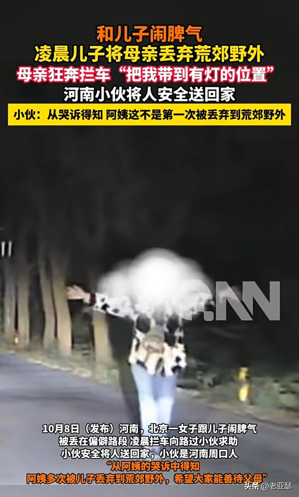 这真的是太大逆不道了,这就是个不孝子。 亲生儿子多次将母亲遗弃荒野。 这是我在10月9日看到的一个消息。 近日,母亲和儿子的闹脾气,被儿子遗弃在荒郊野外。 这儿子实在是太丧心病狂了。 这位母亲只得拦车,后来一河南小伙把她送到家。 令人发指的是,这儿子不是第1次见母亲遗弃在荒郊野外。 想不到小的时候把他带大,母亲老了,这儿子却开始不孝了。 真是令人唏嘘不已。