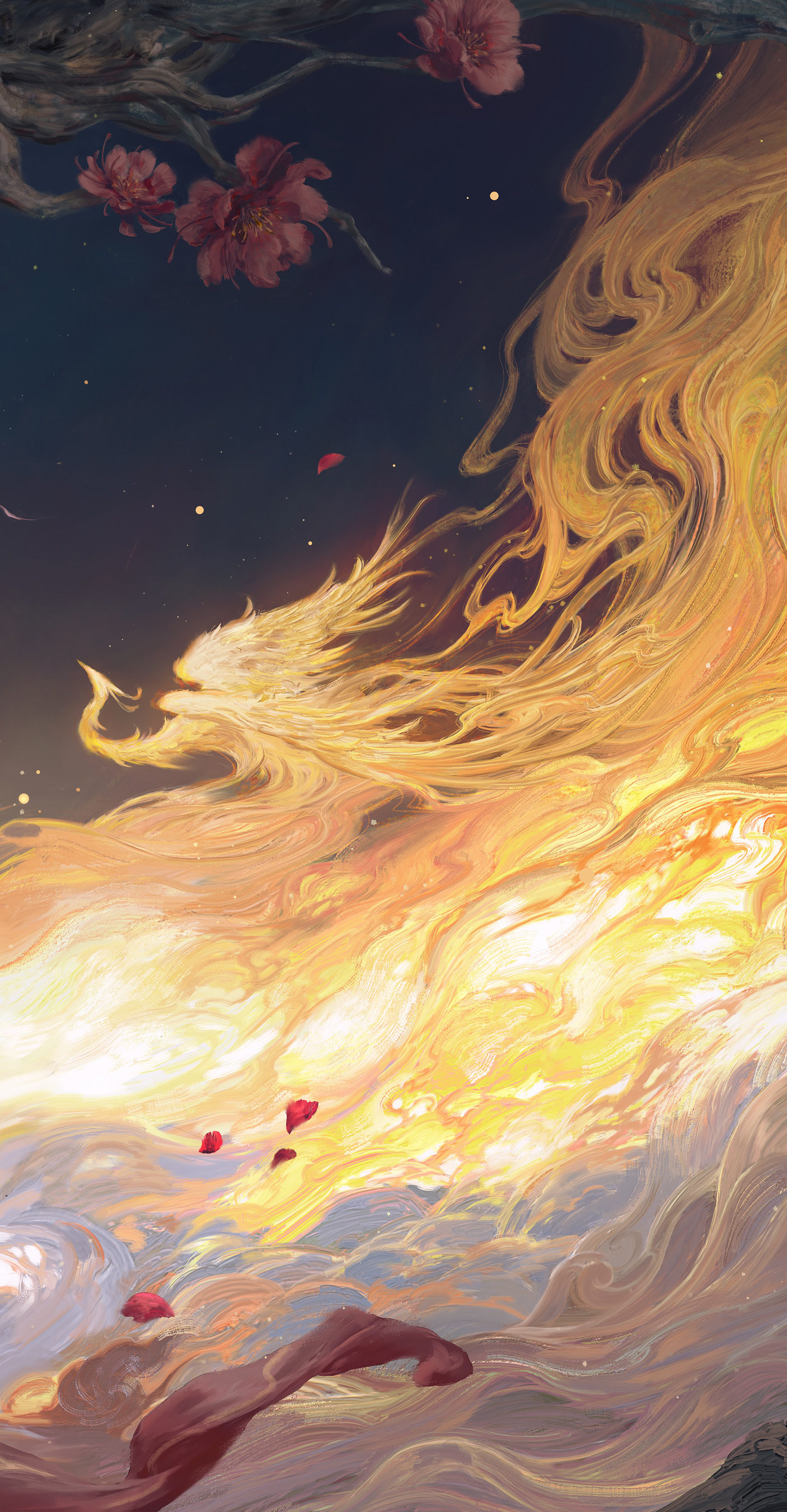 烈焰、朱雀、火桑花,线从心起,光向内生,流焰如歌,线条如韵,每一处落笔都旨在刻画她的明媚与生动,每一次构图与色息的反复推敲,都只为留住她回望那一瞬的温度与光。
