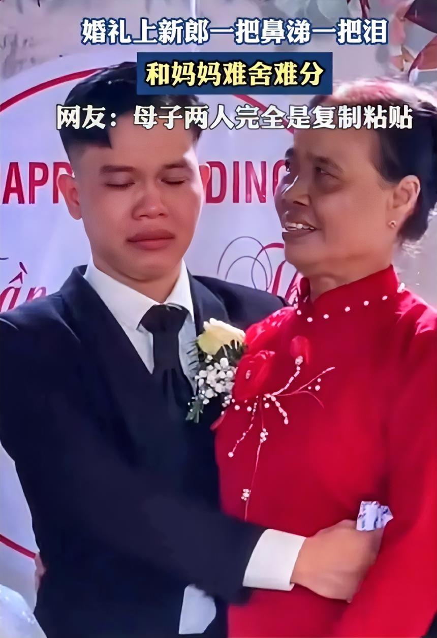 新郎抱着母亲哭, 可能是舍不得母亲, 重要的是你们有没有看见一个细节! 新娘想要给他擦眼泪,他躲开了,躲开也就躲开吧,后面他居然用自己的手擦了鼻涕,下一秒抹在新娘的婚纱上! 这场面真的让人哭笑不得啊!自己人生中大喜事,父母辛辛苦苦把自己养这么大,可能当天也是有点感慨,然后落泪了!这也是可以理解的! 但是鼻涕抹婚纱这不好吧!不知道新娘的婚纱是买的,还是租的?如果是租的被商家看见会有何感想?