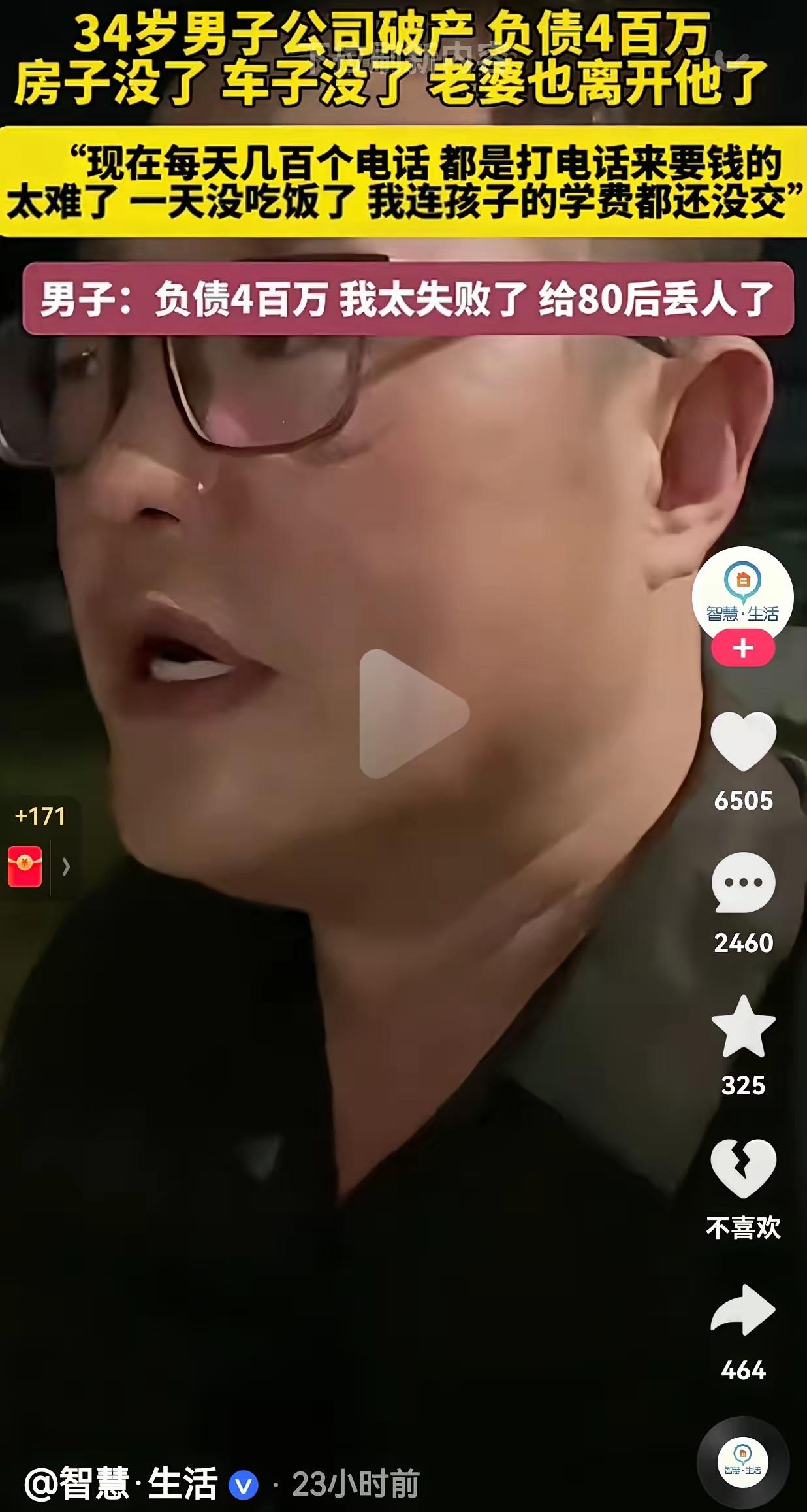 一男子发视频称,今年34岁,公司破产了,负债4百万元。破产的那一刻,老婆毫不留情地离开了他。到现在为止,他房子没有了车子也没有了。每天一顿像样的饭也吃不起了,只能白馒头就水喝。 更令人悲催的是,每天接到几百个电话,这些电话都是来要钱的现在就连孩子的学费也交不起了。 网友评论: 不是老婆离开,是你们夫妻两个合计好了,小孩跟妈妈,债务你来背,都是负债人的常规操作了。 没什么大不了,绝大部分80后哪个不负债哦!我170➕,扛着呗,实在抗不了就先活着...爹妈和娃一定要管,女人愿意留那就一起管,不愿意那就放她自由!!有时候想想不去抗过平淡日子也挺好的。 同样的事,朋友的妻子和她的几个闺蜜合伙搞了公司,亏得裤衩都不剩,她老公帮她还清了几十个!当时搞公司的钱也是从她老公那挪出去的。 这一经历让男人看清妻子不是一名合格的贤妻良母,不值得留恋,与其活在痛苦不堪中,不如重新振作,保不齐还有重新翻身的时刻。