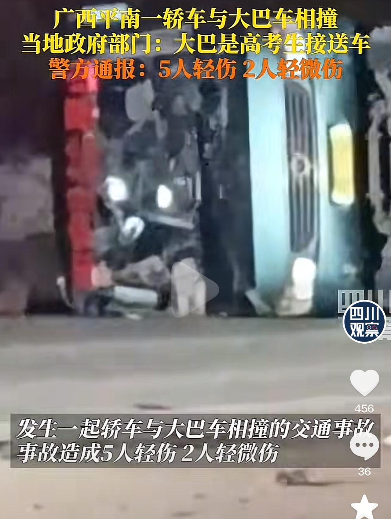 最不愿意看到的事发生了!广西南平县接送高考生的中巴车与轿车相撞,导致中巴车侧翻 视频中显示,在一路口处,一辆轿车撞到了中巴车的尾部,事故造成了七人受伤,五人轻伤,两人轻微伤,已送医治疗。 不幸中的万幸,只是受伤没有死亡,发生在高考之后。 只是,这批刚结束高考的孩子还没来得及庆祝,就经历了一场劫难,肯定吓坏了,孩子们福大命大,希望他们都能取得好成绩。 另外行车上路一定谨慎,握紧手中的方向盘,安全无小事,时刻注意。