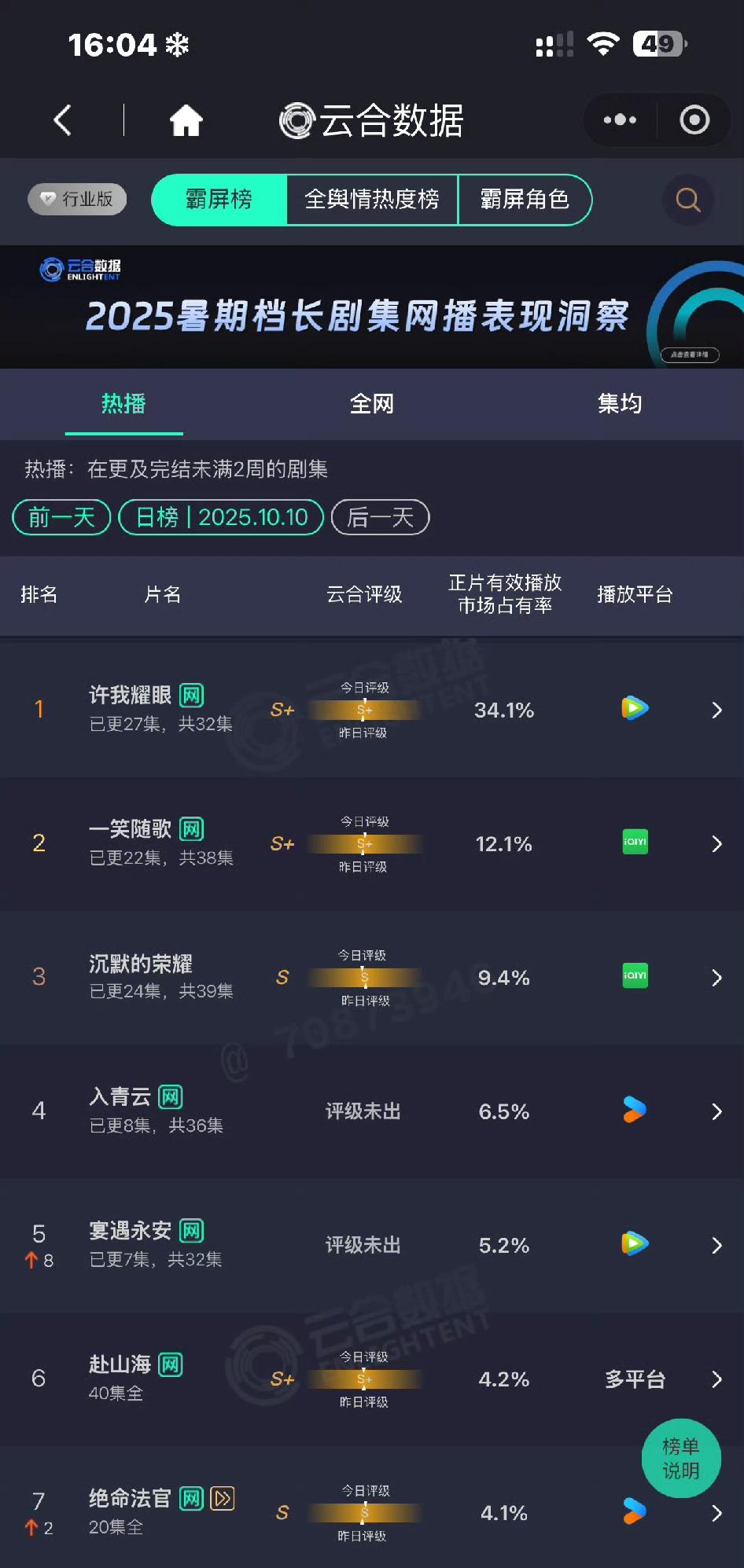 现在的电视剧都怎么啦!一眼望去全是扑扑的,大家都不看剧了吗? 《许我耀眼》市占率34·1%依然位居榜首,而其他正在热播的《一笑随歌》《沉默的荣耀》《入青云》《宴遇永安》《绝命法官》都拉胯的不行,真想问这些剧能赚到钱吗? 大家最近都在追哪一部呢?