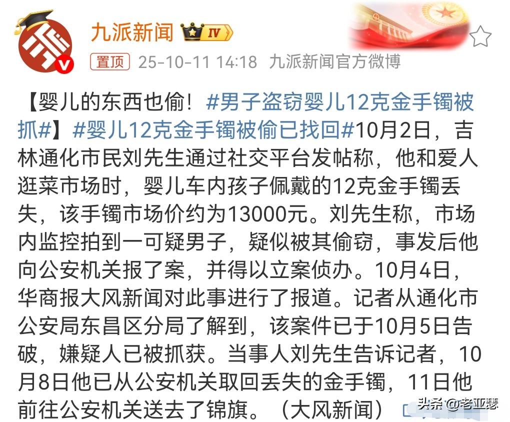 这小偷太没底线了吧。 竟然连婴儿的黄金都偷。 娃娃戴的12克金手镯被一个小偷给偷走了,价值13000元,家庭条件不错。 可以看出来对这孩子非常的疼爱。 偷这么贵重的东西,抓住了必须严惩。 男子已经被抓,家长也已经送上了锦旗。 还挺会做人的,还知道送锦旗感谢一下。 想必警方心里也是很有自豪感。 挺好的。