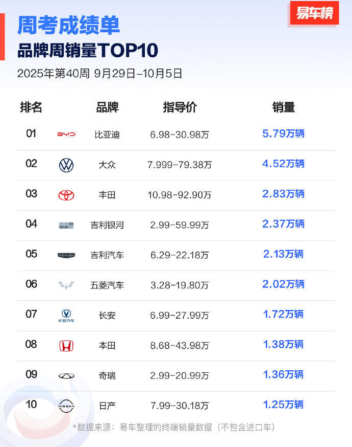 最近一周的销量排行榜,比亚迪仍然无法撼动,大众丰田依旧遥遥领先,吉利和银河算到一起再冲一把能位居第二。