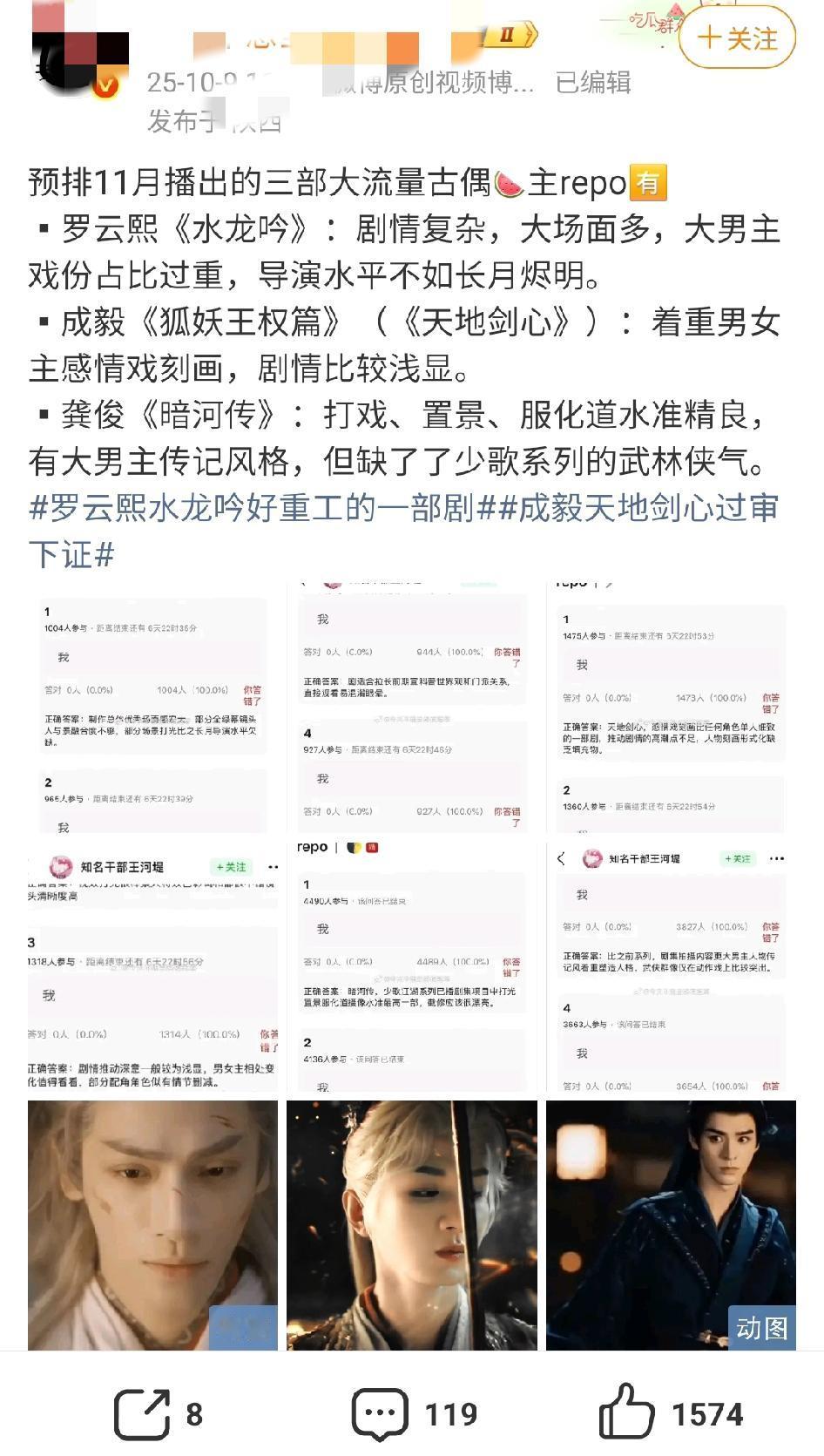 会扑吗?罗云熙成毅龚俊新剧大事不妙啊! 近日,《长月烬明》《天地剑心》《暗河传》三部万众瞩目的大男主剧频频异动,这是要空降开播的信号啊!因此不少瓜主发布看片repo,🈶网友总结如下: 《水龙吟》不如《长月烬明》 《天地剑心》只有感情戏能看 《暗河传》不缺少《少年歌行》侠气 从发布的预告来看,个个都是强大的高颜值阵容、精美服化道、行云流水的打戏……精彩的不行,都不错啊!会扑我不信!大家怎么看?龚俊 罗云熙