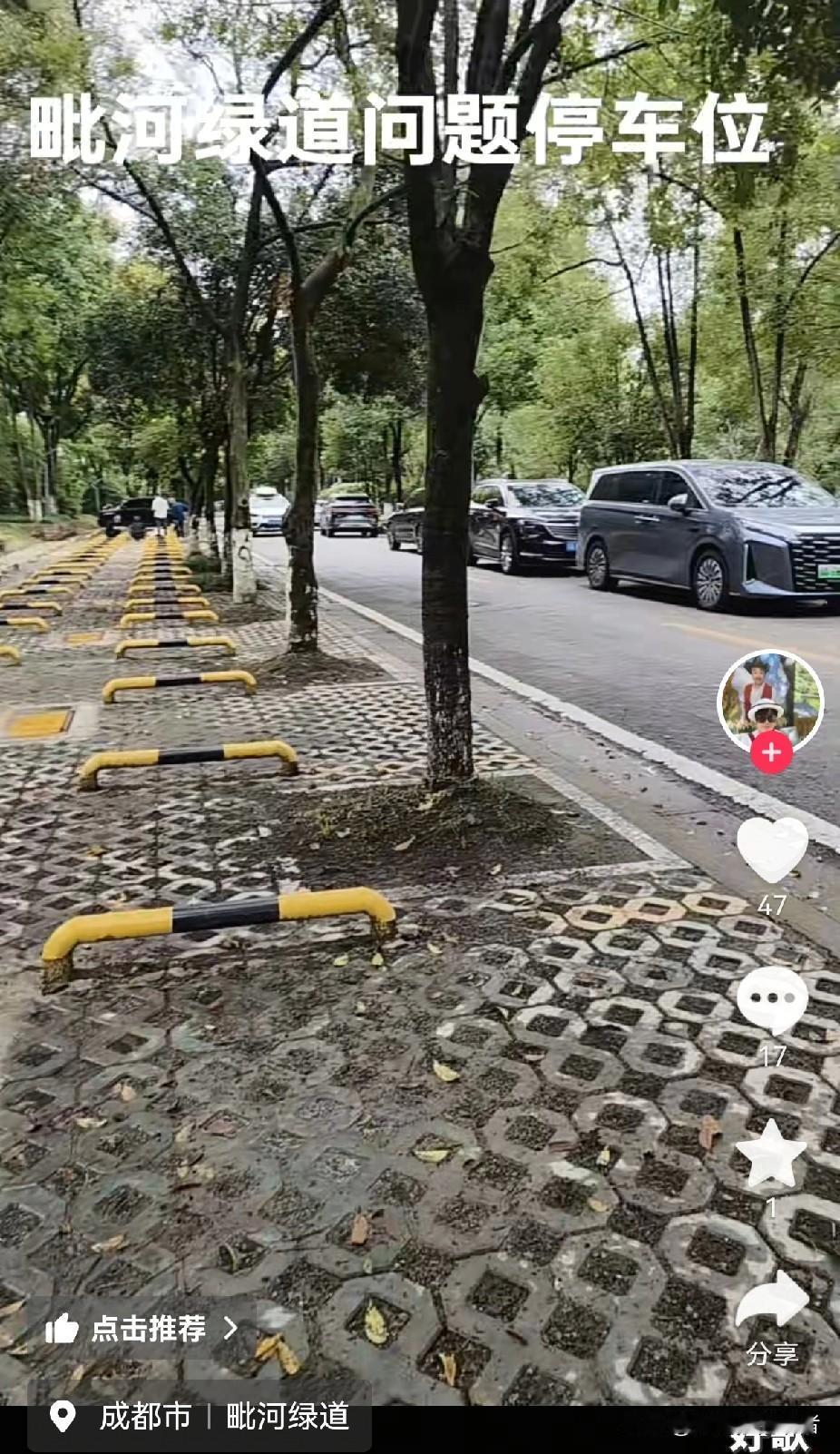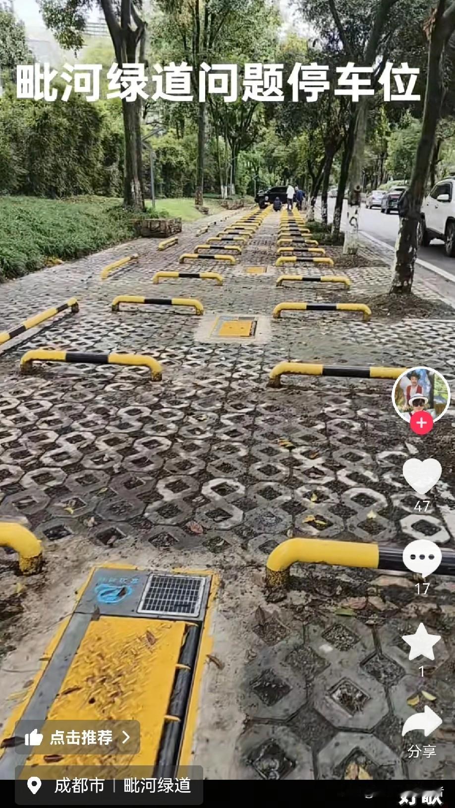 仔细一看才发现是隔起来的是一个个停车位,估计成都毗河绿道的管理者的初衷是让车辆不要横七竖八地乱停放,结果这一弄,要么司机们的车技有问题不敢停了,怕一把停不进去或怕车擦了,或者要么想停车的司机们还是怕麻烦,干脆直接靠路边停算了。 这样的停车位显然看着有点别扭,也不那么美观。