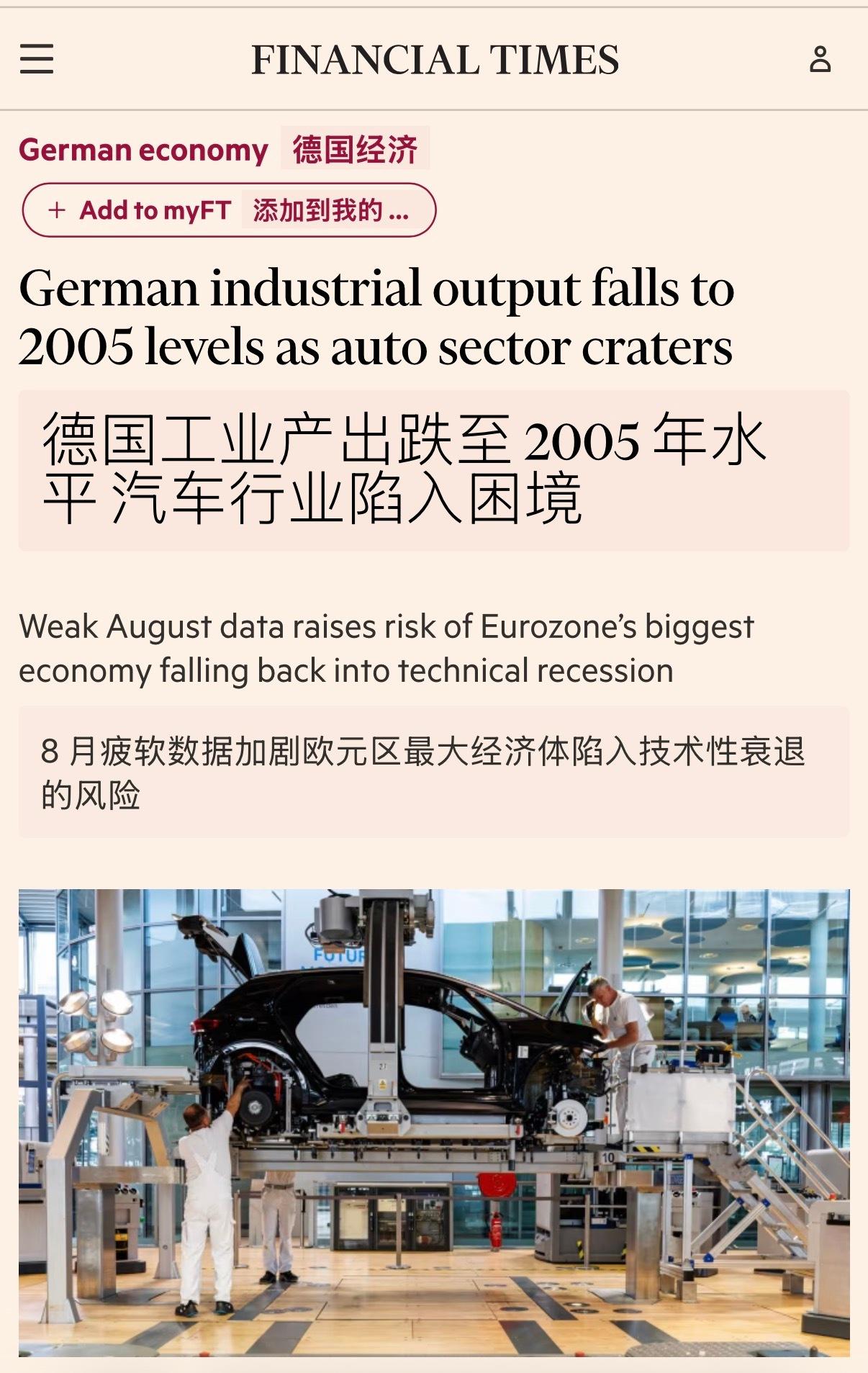 金融时报发文:直言德国工业产出实力,回落至2005年的水平,德国至关重要的汽车行