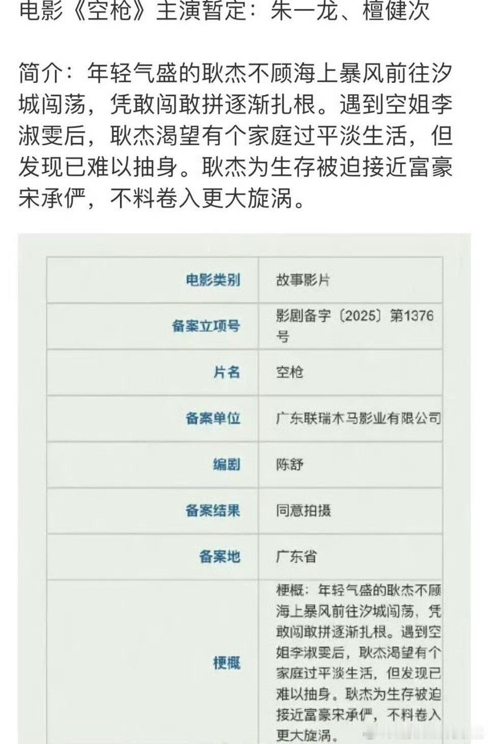 《空枪》传朱一龙 和檀健次,联瑞出品