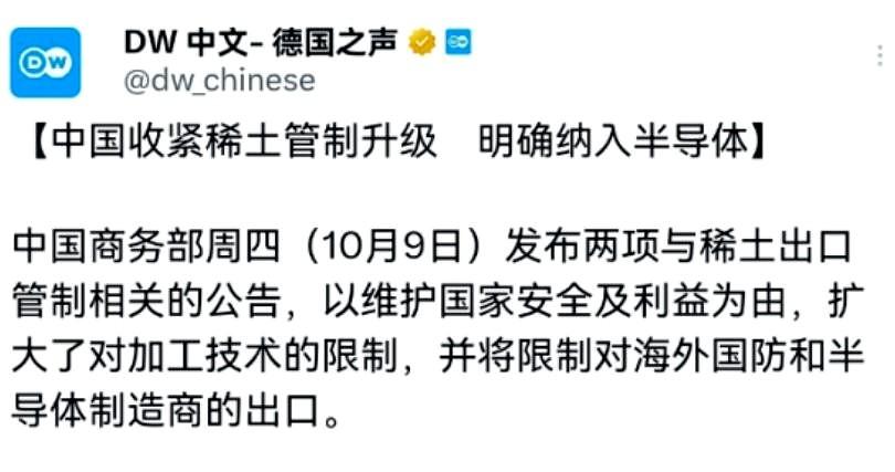 在我们宣告对稀土技术进行管制之后,德媒感到事态严重! 商务部发公告,稀土全流程技术不让随便出口。 德国之声说中国这次是来真的,半导体和军事双重限制,欧美头疼。 德国汽车行业80%新能源汽车电机依赖中国钕铁硼磁体。 网友对此表达观点: 二战后的红利快吃完了,全球贸易壁垒越来越严重,我们必须未雨绸缪,当所有手段都用完的时候,战争就会来到,一切都是为了利益,和平的手段获取不到利益,他们就会铤而走险。 怎么监督外国?怎么落实到位惩罚到位???哪位大神给科普一下??? 这是中国对特朗普不抱任何希望了 这小子油盐不进 只能打张王牌 看这小子能爬下吧 这次最让人高兴的是:咱也会玩长臂管辖了,老美享受享受吧,你们发明的,抄抄作业挺好