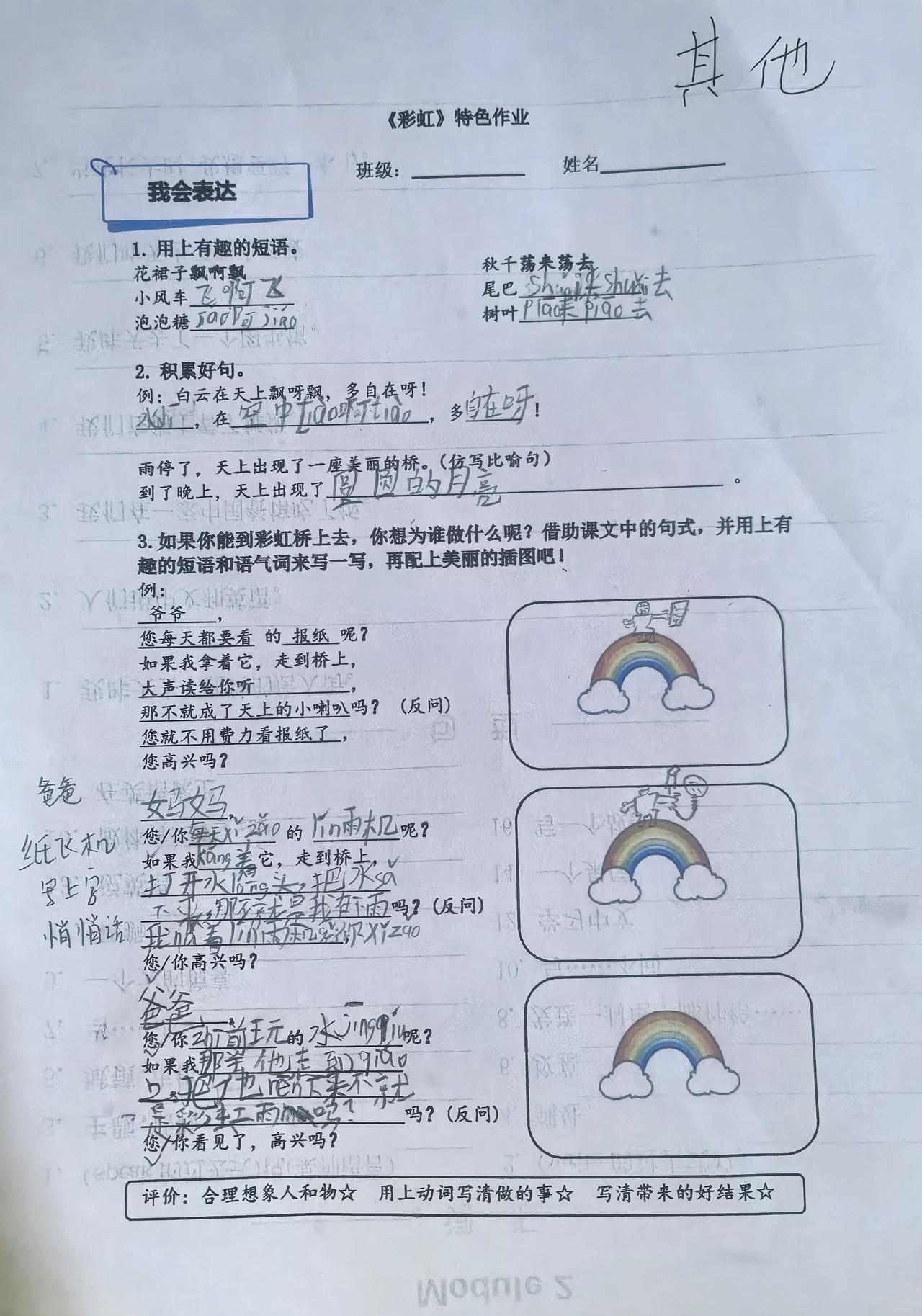 昨天二宝带回来一份语文特色作业,其中的第3大题是这样的: 如果你能到彩虹🌈桥上去,你想为谁做什么呢?借助课文中的句式,并用上有趣的短语和语气词来写一写,再配上美丽的插图吧! 说实在的,这道题真把我给难住了,苦思冥想总感觉写不出来。 最后二宝自己完成了。 虽然不是特别好,单总比我白卷好太多了。 如果让你做,你能完成吗?