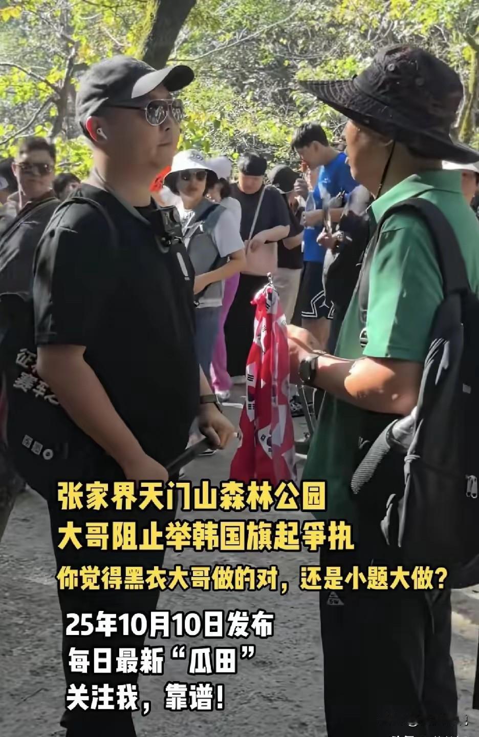 在张家界天门山景区,那个阻止导游举韩国国旗的黑衣男子真的丢国人的脸!人家是韩国旅