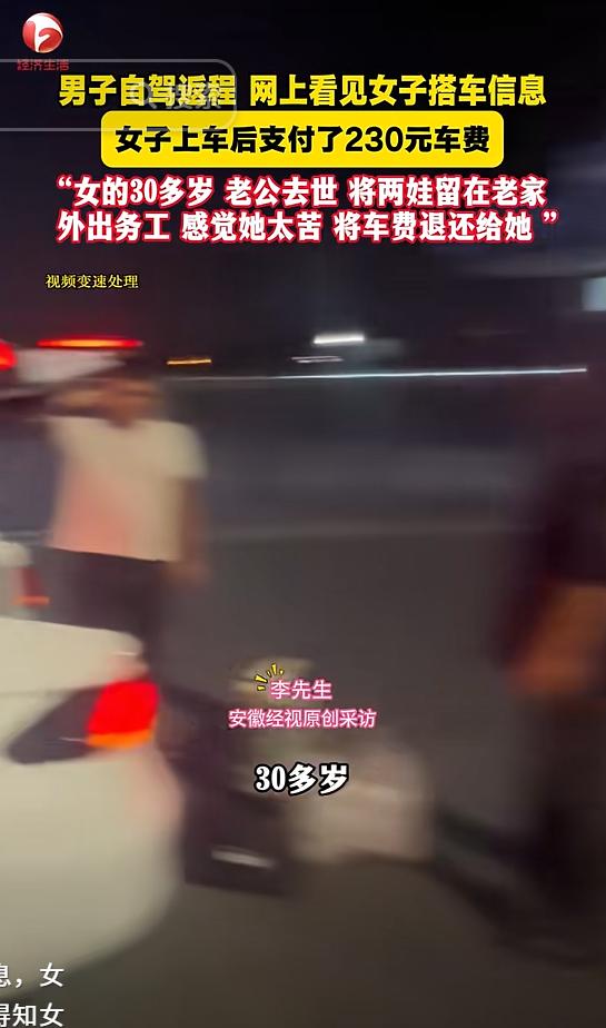 河南一男子自驾回家,网上看到美女搭车信息,就联系对方,想着路上能聊聊天,顺便弄点油费,没想到,对方一上车就给了他230元车费,可是,途中他听到女子的遭遇后,觉得她过得太苦了,决定把车费还给女子,女子对他表示感谢,男子却说:我赚钱比你容易! 一笔230元的顺风车费,从乘客的手机转到司机的账户,又在河南去往宁波的路上,完成了一次意想不到的逆向旅行。 这笔资金的流转,绝非仅仅是数字层面的变动。它背后或许蕴含着复杂的经济逻辑、微妙的利益关系,远非简单的数字增减所能涵盖。它背后,是一场关于共情、尊严和社会暖意的真实展演。我们不妨从三个切片,看看这个小小的善举到底有多大的分量。 故事的开端,纯粹是一场交易。国庆假期甫过,一位年逾而立的女士欲从河南民权前往宁波慈溪务工。此时,司机张先生车内正有空座,为分摊油费,他打算寻一同行之人。双方通过网络联系上,一切都那么顺理成章。 乘客甫一上车,便即刻主动掏出手机,熟练地打开微信,迅速完成操作,将230元车费转账支付。司机也当即点了收款。契约达成,关系清晰。 然而,行车约一小时后,一个视频电话打破了车内平静的商业氛围。电话那头,是乘客的孩子。 她瞬间情绪失控,背过身去,不想让司机看见,只用手背偷偷抹掉止不住的眼泪。这一幕,被张先生从后视镜里看得一清二楚。 这个无声的场景,精准地击中了司机的内心。他自己也是一位父亲,有个10岁的孩子。他太能理解那种为人父母的心情了。 他没有马上开口,而是体贴地调低了音乐音量。等通话结束,在他的轻声询问下,乘客才讲出了自己的故事。 她身为单亲母亲,境遇令人动容。去年,丈夫因病溘然长逝,生活的重担自此全压在她肩上。如今,她独自一人含辛茹苦地抚养着两个孩子。大的13岁上初中,小的才5岁,都由婆婆在老家照看。此次她毅然出门,肩负着沉甸甸的责任。她的步伐坚定,心中只有一个信念——撑起这个家,让家人在风雨中也能有温暖的港湾。 当共情的闭环形成,退款这个行为,就成了一种必然的情感流露。 当这230元在临近目的地时被退还,它的属性就彻底改变了。它不再是车费,而是一种更复杂的符号。 对于这位月入四千多、大部分钱都要寄回家的母亲来说,这笔钱无疑是一份实在的帮助。但它的意义远不止于此。 有网友的评论一针见血:这退的不是钱,是“底气”。 司机的那句“我们比你赚钱容易”,没有丝毫居高临下的施舍,而是对她奋斗价值的朴素承认。它传递的信息是:你的辛苦,我们看得见,也值得被尊重。 善举并未止于退款。司机坚持把她送到工厂门口,看着她安全进入后,才挥手放心离开。这些额外的举动,将一次冰冷的交易,升格为人格平等的温暖关怀。 这个善举的能量,也没有终结于小小的车厢内。司机事后将这段经历发到网上,让一次私密的互动,进入了公共视野。 视频意外走红,并形成了一个感人的情感回流。乘客本人也刷到了这条视频,从司机的视角再次感受这份善意,感动得再次落泪。 这股暖流激发了广泛的社会共鸣。有人联想到自己的亲人,有人分享自己帮助他人的经历,无数祝福涌向这位坚强的母亲。 这个微观事件,也无形中让“外出务工的单亲母亲”这一群体困境获得了更多关注,具备了宏观的社会意义。 回头看,这230元经历了三个层次的价值演变:由个人身份的共鸣触发,在互动中升华为对尊严的支持,最终通过传播成为触动公众的社会叙事。 赠人玫瑰,手有余香。张先生退还的,远不止是230元,他启动了一场关于善良的社会对话,那份“余香”,早已溢出了车厢。