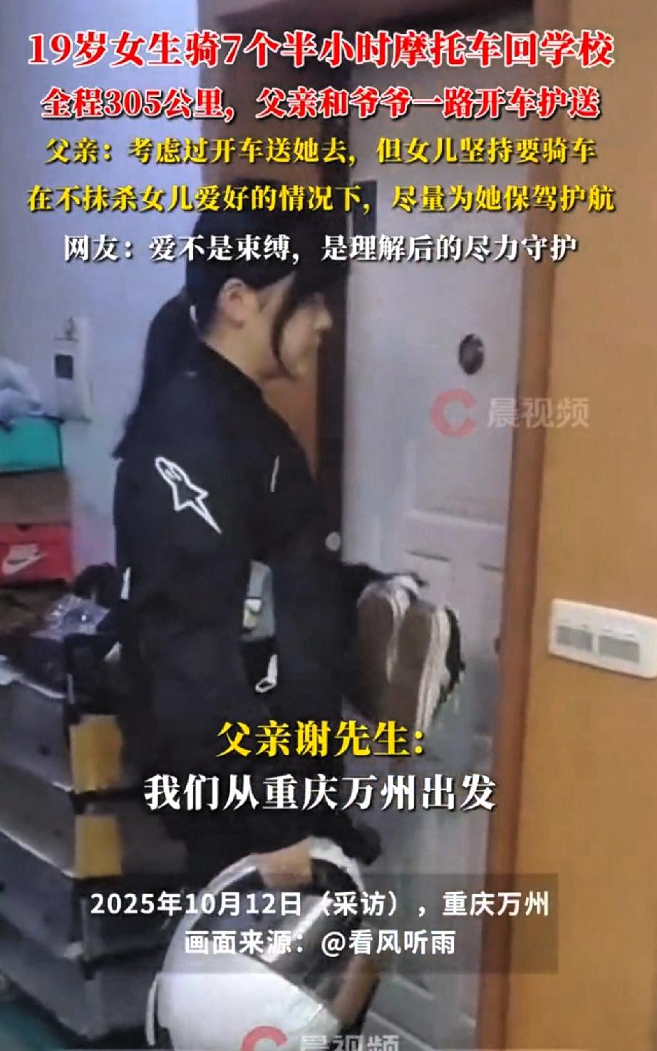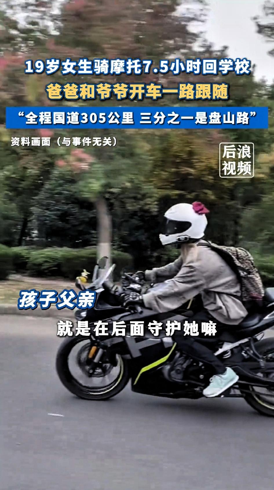 17岁女生骑摩托车7.5个小时回学校 爸爸和爷爷开车一路跟随,默默守护。全程国道305公里 三分之一是盘山路。父亲:我们肯定不放心,就选择用这种方式守护女儿。 这就像一场特别的护送之旅,爸爸还开车305公里偷偷护送骑行的女儿返校。父爱如山,这种方式的父爱太棒了——理解支持并默默守护,重庆的女娃就是幸福 17岁正是无畏又勇敢的年纪,女生选择骑摩托返校,肯定有她对自由和独立的追求。而爸爸和爷爷的跟随,是满满的爱与担忧。他们或许在后面看着女儿的背影,既为她的勇敢骄傲,又怕她路上有闪失。这样的亲情太让人感动,这一路有亲情护航,女生的返校之旅一定特别难忘。 爱不是束缚,是爸爸和爷爷一路护送回的学校,网友一句话诠释了爱与被爱一个人了,爱不是束缚,是理解后的尽力守护,我给这个当爸爸的点赞,理解万岁 都说重庆的男人对老婆好,原来对女儿也是无尽的宠爱。有这样的父亲女儿真是太幸福了!