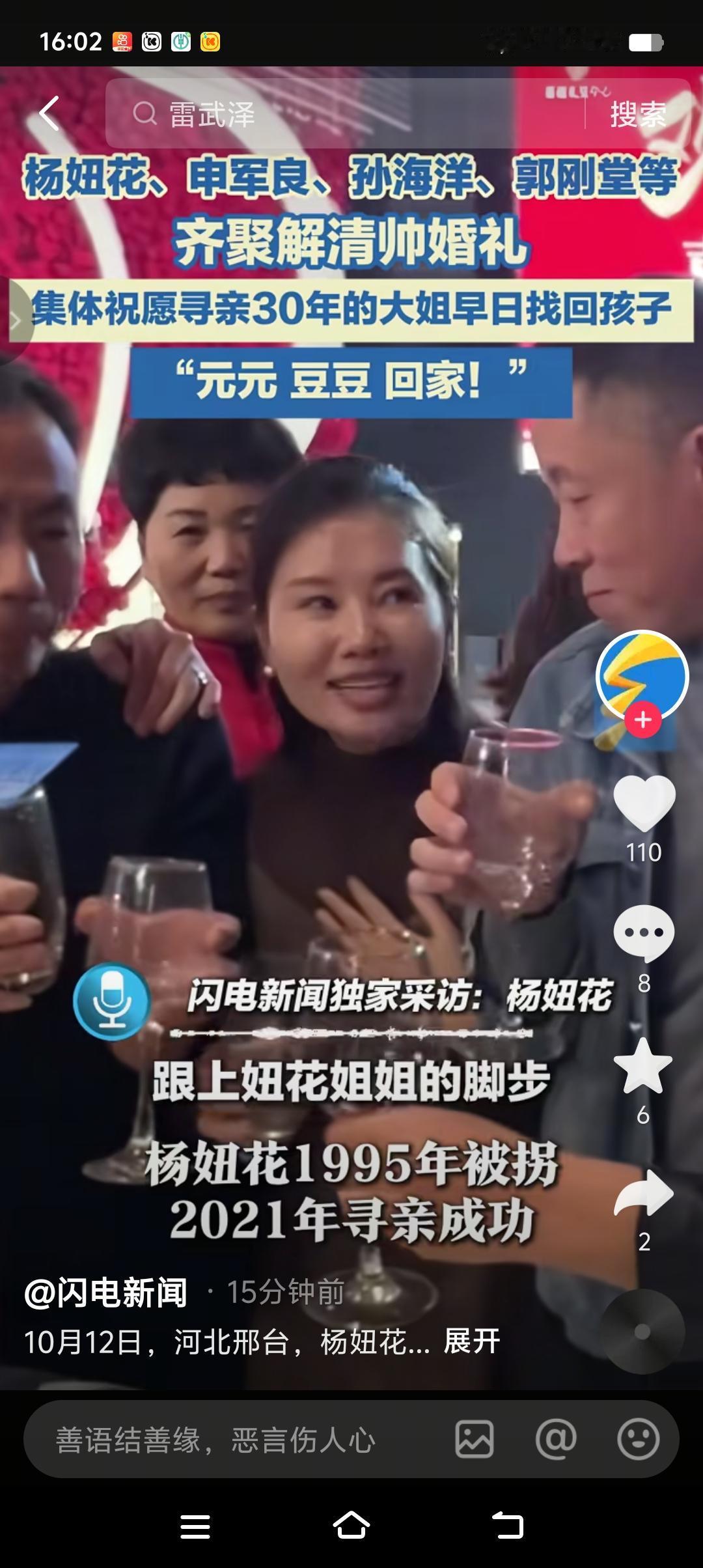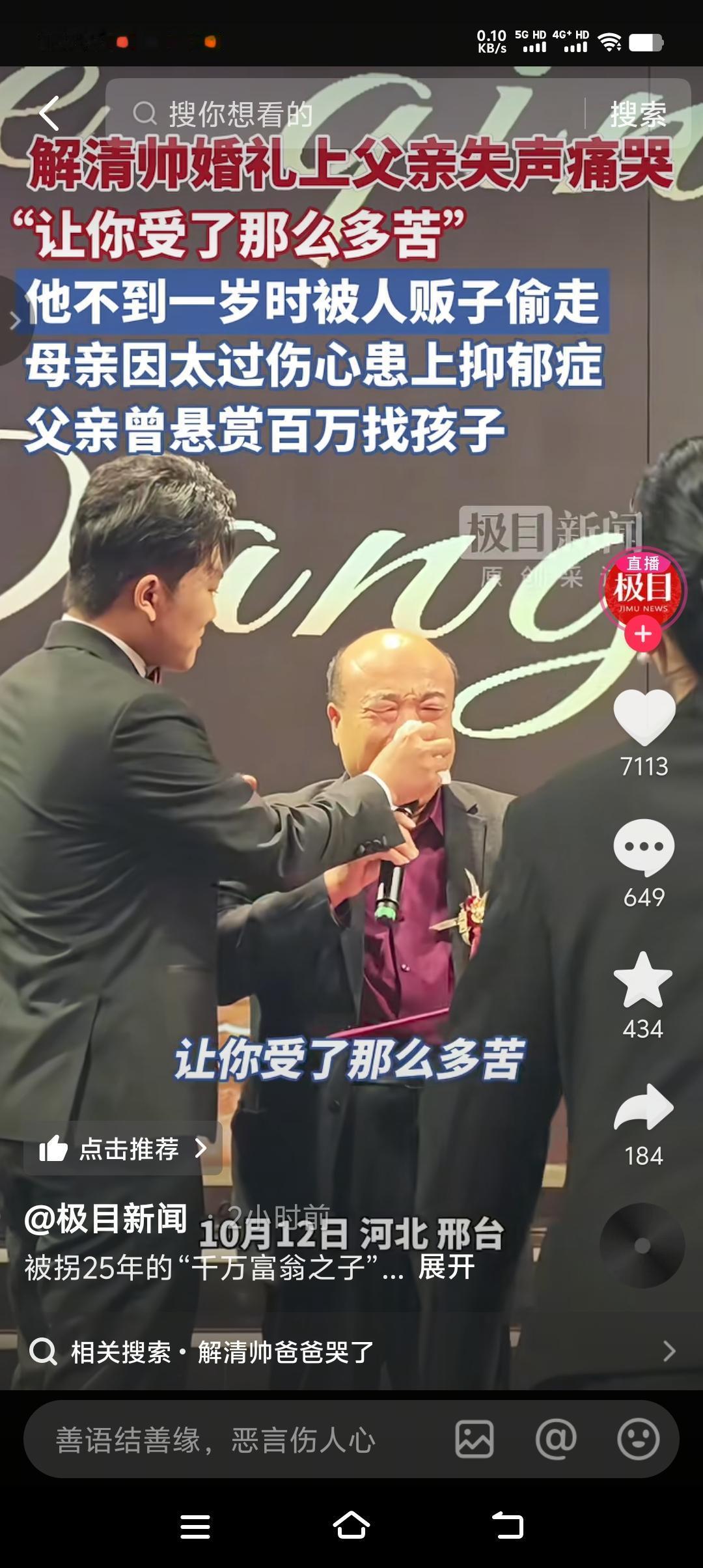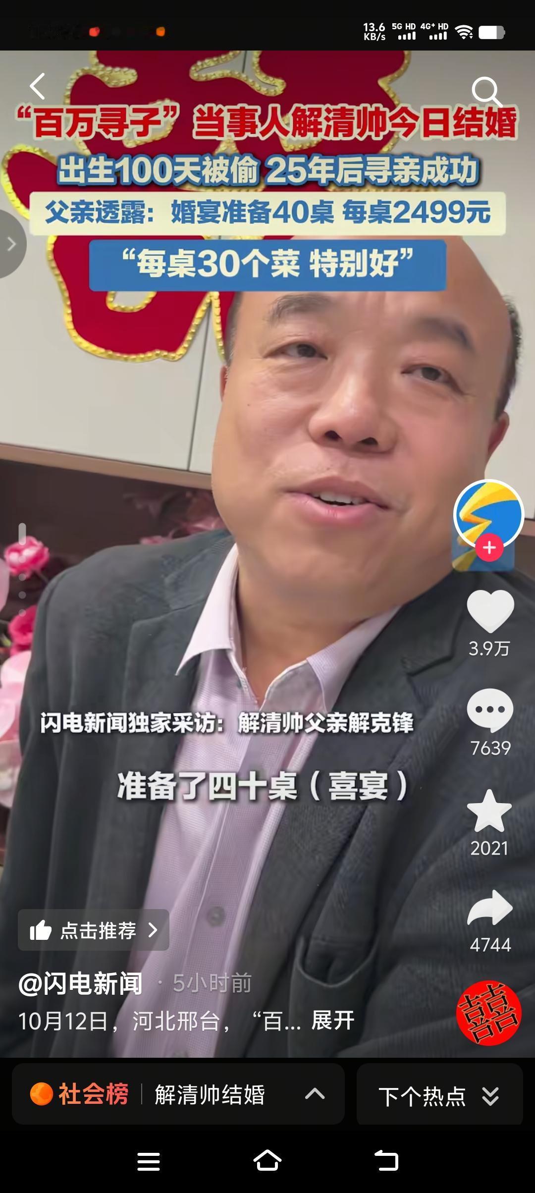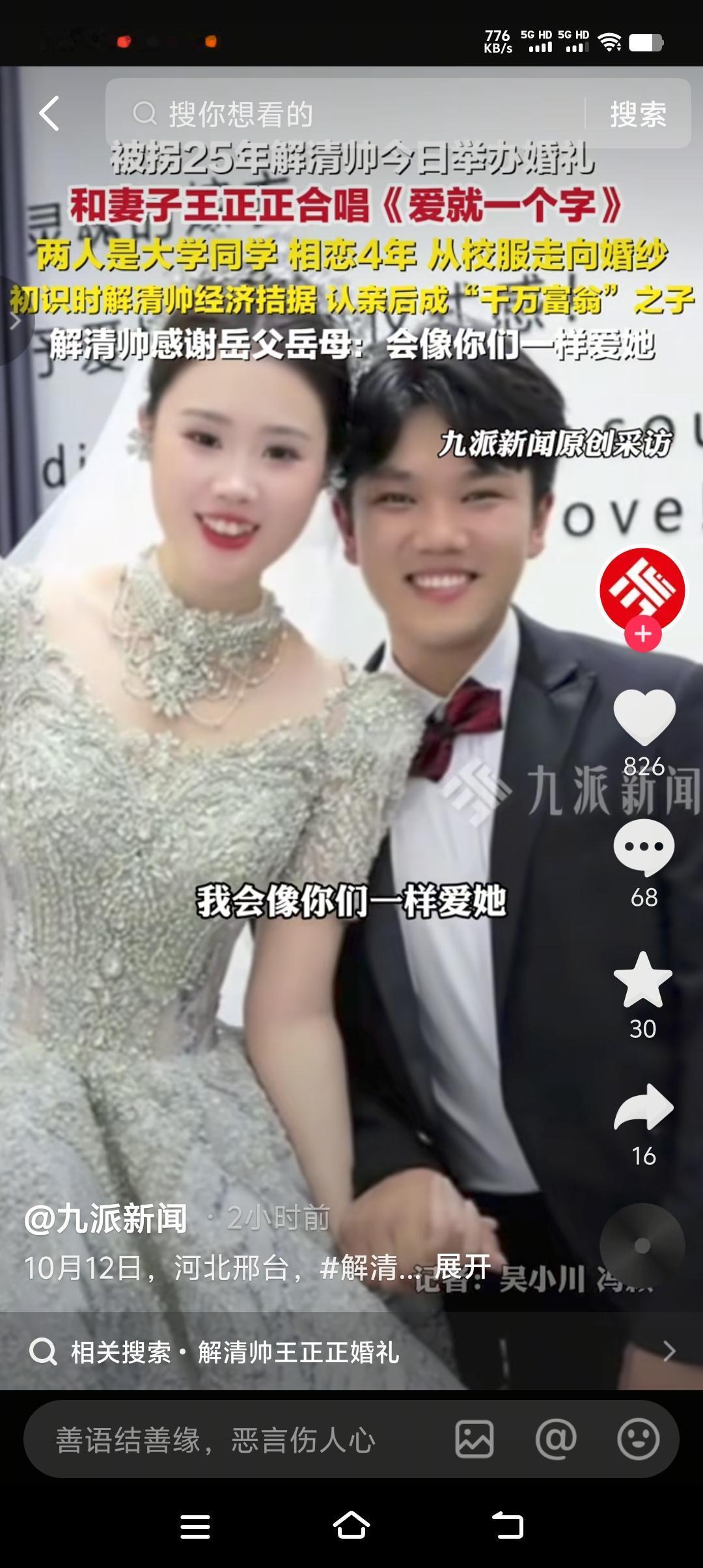 网红就是不一样,结婚就是新闻,好几家媒体争纷报道,好不气派。直播间在线人数10万加,闪电新闻现场直播,杨妞花、谢岳、申军良、孙海洋、郭刚堂等一批同病相怜大网红齐聚婚礼现场。清一色红旗轿车大方而又庄重,尽显新郎新娘一片感恩之心和爱国之心。 一岁被拐,25岁回到千万富翁父亲身边,可以说是一夜之间实现人生逆袭翻盘。虽然说25年人生是坎坷的,但让人感到欣慰的是亲生父母亲至始至终没有放弃寻找儿子的决心和信心。 新娘是解清帅大学同学,两人相恋四年,也就是说在没寻亲之前就已经相恋了。从出租屋到走进婚姻殿堂,从初遇拮据到成为千万富翁之子,可见两人的爱不论贫穷,只论真心。最后让我们祝福这一对新人吧!感恩的人永远受上天眷顾,新婚快乐!