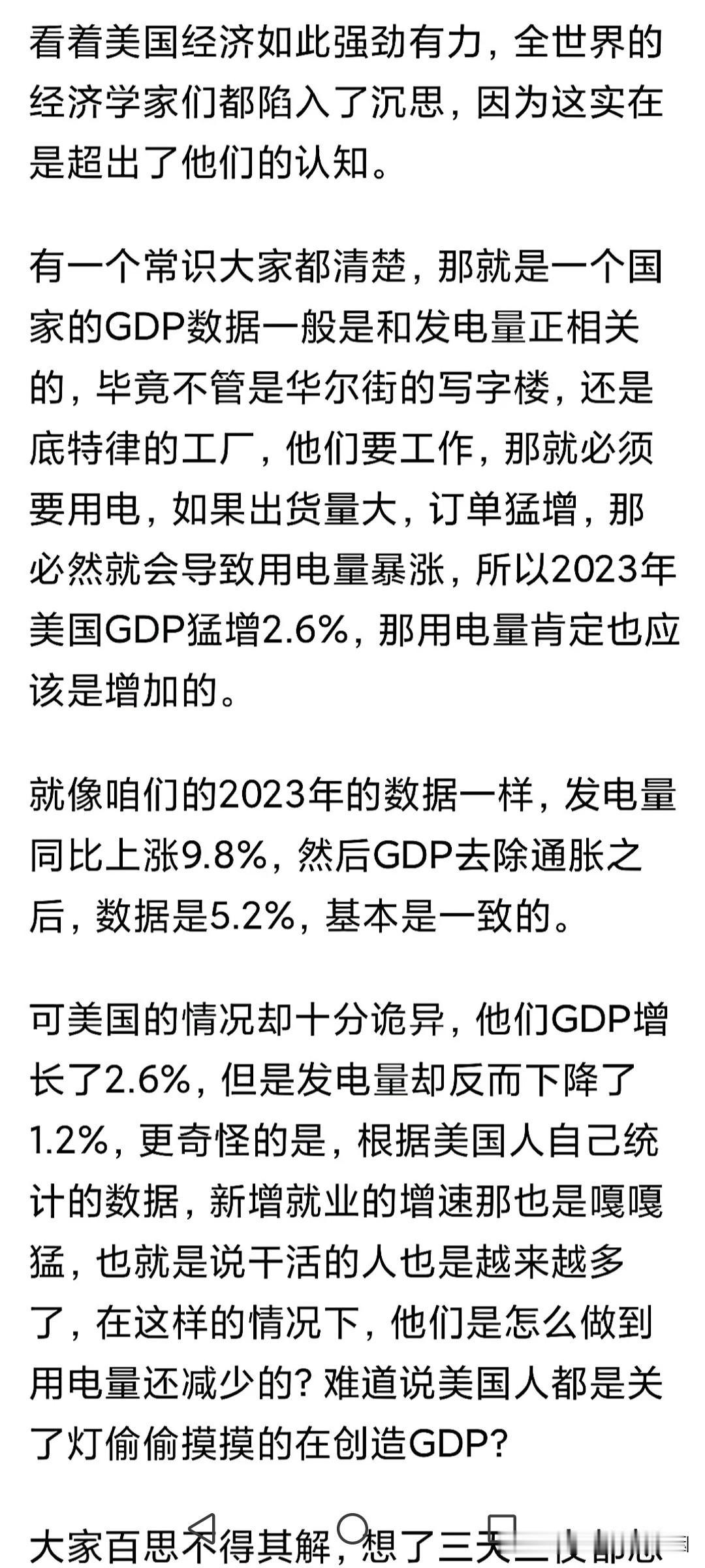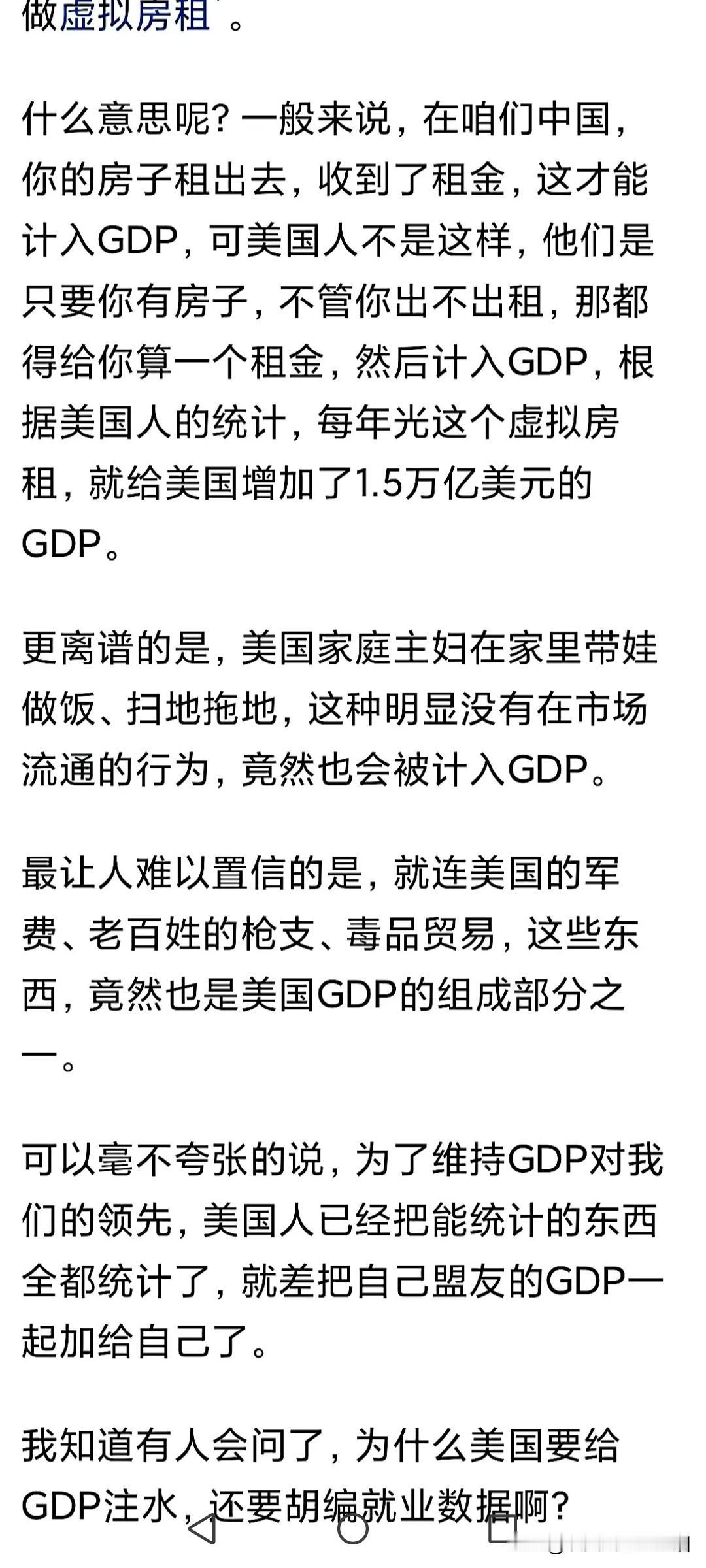 美国经济数据造假,是世界众所周知的事情,因为美国要维持他们世界第一的地位,所以必须要造假。美国虚空制造经济总值,这样才能保证美国仍旧是世界第一强国。如果美国承认自己经济上不去了,对美国股市和投资者信心,将会是极为沉重的打击。 一旦美国认输,也许美国上百年的世界第一的繁荣,就会彻底终止。所以在没有出现重大问题之前,美国一定是要全力的抬升自己的经济总值。就像2021年,咱们中国的经济总值,一度超过美国经济总值的70%,但是美国立刻就急了。立马开启了大放水和数据造假模式。接下来三四年时间,美国经济总值接近上涨10万亿美元。而咱们这边将货币汇率从1:6降到了1:7,这才让今天的数据对比。重新掉到了60%多一些。 这样美国又有了面子,觉得自己仍然是世界第一,但是美国的经济总值,缺乏实业和工业的组成。 美国工业生产总值不够高,主要来自于第三产业和服务业,这些经济数据可以无限造假。反正就是造出一个美国是世界第一的样子就可以了。美国不在乎经济是否发展,美国只在乎经济数据的提高,一切只看数据。 而且川普也是一个极其好面子的人,无论如何也要将美国的经济总值,持续增长上去。因为任何一个美国总统,都不愿意接受数据下滑的事实,都会指示手下的机构,提高大数据里面的总值。所以美国的数据造假,不是今天开始,也不是明天结束,而是有规模地持续了多年。 从拜登时期和川普时期以后,美国经济数据造假,会更加严重,反正也没人过来实锤美国数据造假,所以说他们就拼了命的往高里面抬高经济总值,这样维护世界第一经济的国家。美国不会停下来的,一旦停下来,副作用过大,会把美国整个给带崩了。