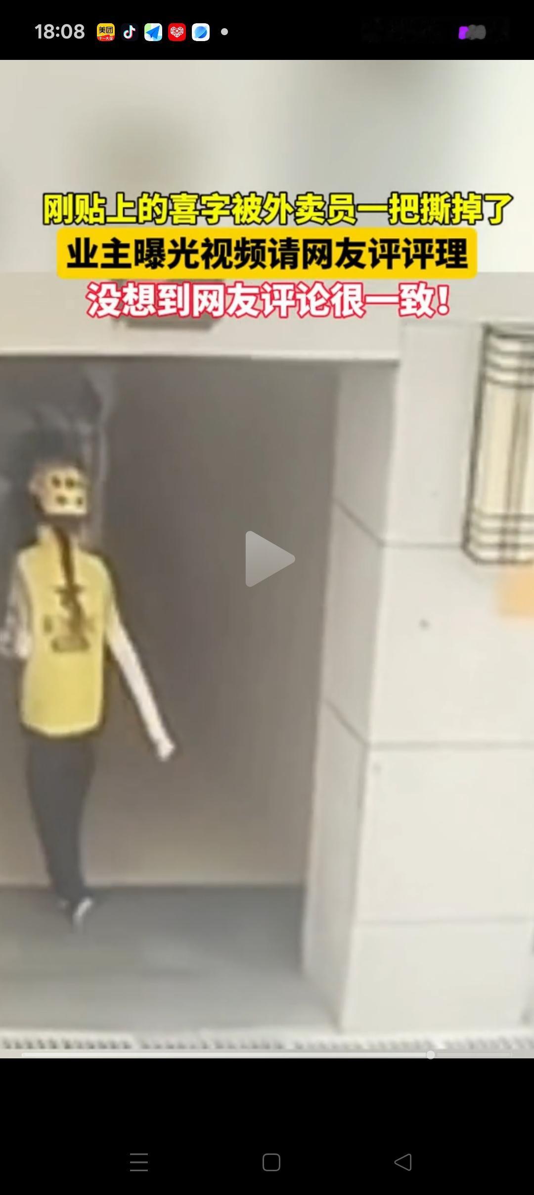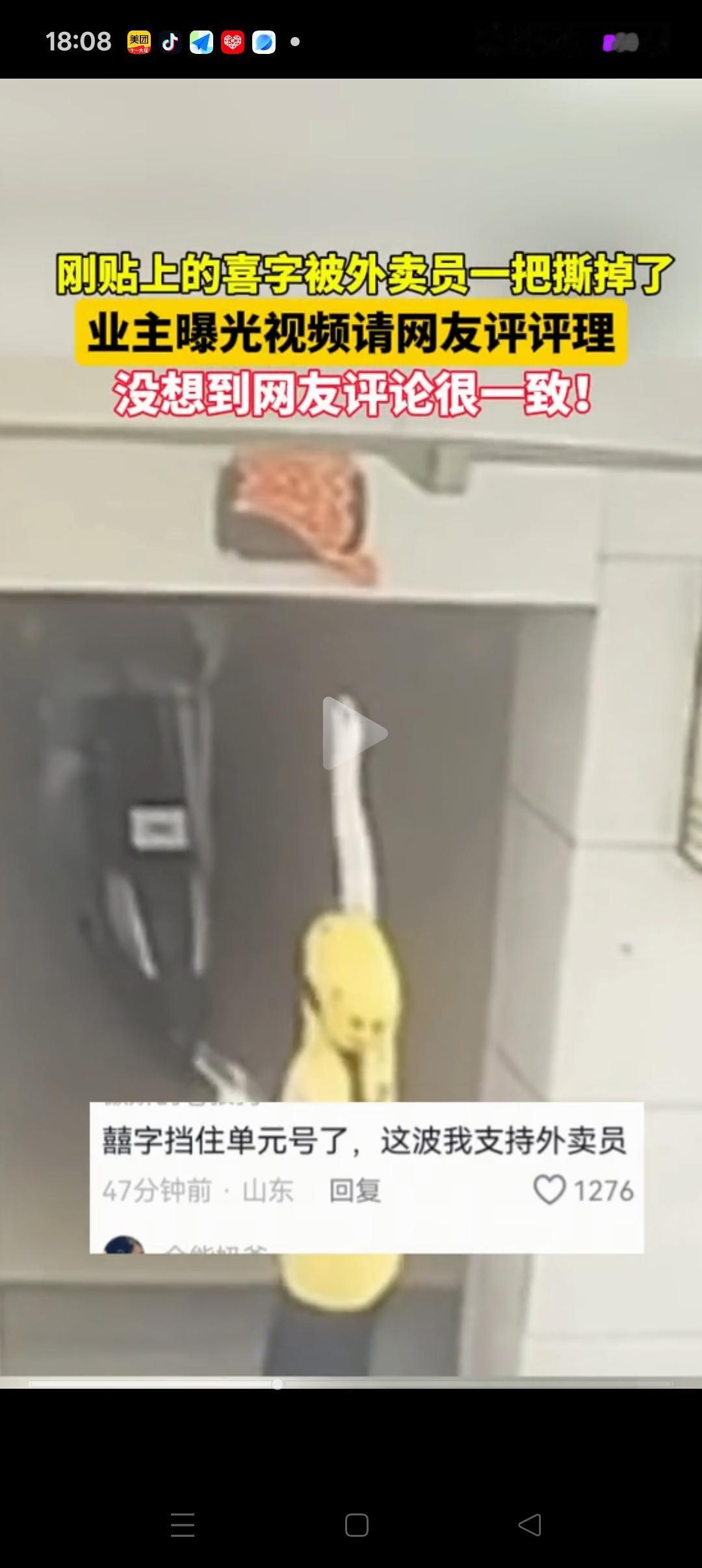 这波我支持女外卖员! 安徽,一女外卖员来到单元门口,因单元招牌被业主贴的“喜”字阻挡了,便跳起来扯掉了“喜”字,还把她直接扔在了地上。 起初我还看不懂她这么做是图啥,直到网友提醒我才意识到,她是为了看清楚这是几单元。 有网友就说了,这是没素质。再怎么样也不能撕喜字,她可以去问一问路,无非就是耽误点时间 我觉得不是这样的,外卖员送外卖是赶时间的,如果每个业主都像这样,那她们的工作难度大大增加了,不合理 再说了,“喜”字应该是贴2个的,贴在边上就好,没必要挡住门牌,应该互相理解啊[祈祷][祈祷] 大家说对吗?